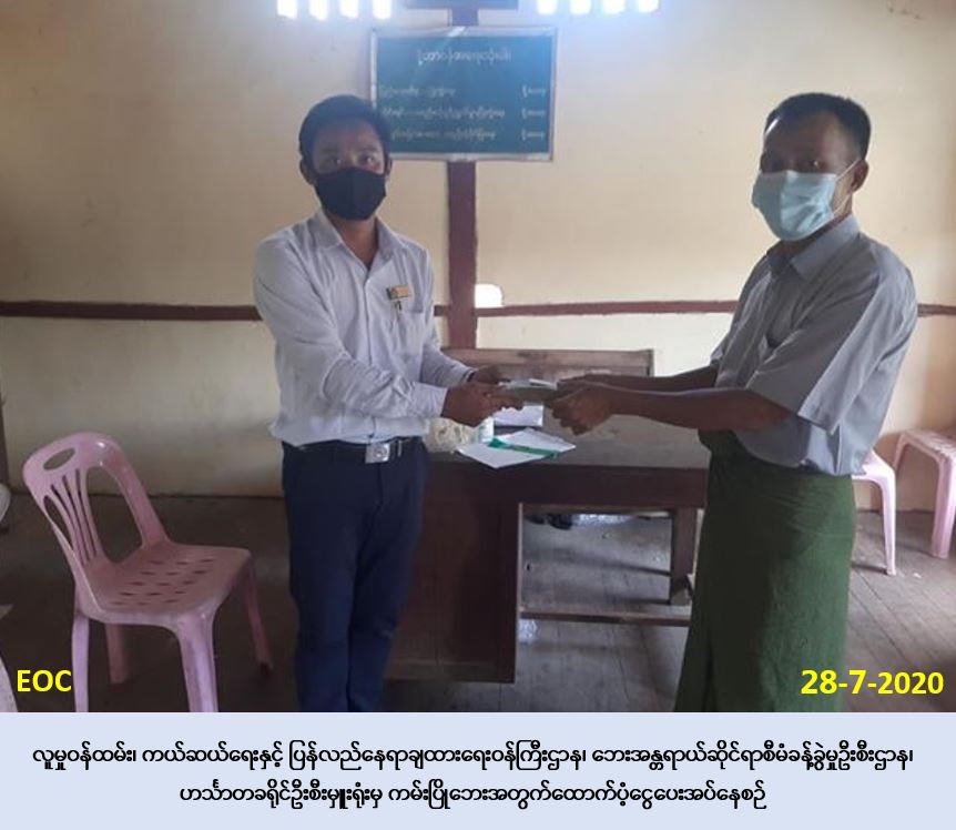 လူမှုဝန်ထမ်း၊ ကယ်ဆယ်ရေးနှင့် ပြန်လည်နေရာချထားရေးဝန်ကြီးဌာန၊ ဘေးအန္တရာယ်ဆိုင်ရာ စီမံခန့်ခွဲမှုဦးစီးဌာန၊ ဟင်္သာတခရိုင်ဦးစီးမှူးရုံးမှ တာဝန်ရှိသူများသည် မြန်အောင်မြို့နယ်၊ ရွှေကျင်အုပ်စု၊ ဘုရားလှကျေးရွာတွင် (၂၄-၇-၂၀၂၀) ရက်နေ့၌ ဖြစ်ပွားခဲ့သော ကမ်းပြိုဘေးသင့် အိမ်ခြေ (၂) လုံးအတွက် အိမ်ဆောက်ပစ္စည်းဖိုး ထောက်ပံ့ငွေ (၂၀၀,၀၀ဝိ/-)ကျပ်၊ လူဦးရေ (၆) ဦးတို့အတွက် ဆန်ရိက္ခာ (၇) ရက်စာထောက်ပံ့ငွေ (၁၂,၆၀ဝ/-)ကျပ်၊ စုစုပေါင်း ကယ်ဆယ်ရေး ထောက်ပံ့ငွေ (၂၁၂၆၀၀/-)ကျပ်ကို (၂၈-၇-၂၀၂၀) ရက်နေ့၊ (၁၁: ၅၀) နာရီချိန်တွင် ဘေးသင့်ပြည်သူများလက်ဝယ်အရောက် ထောက်ပံ့ပေးအပ်ခဲ့ကြောင်း သတင်းရရှိပါသည်။