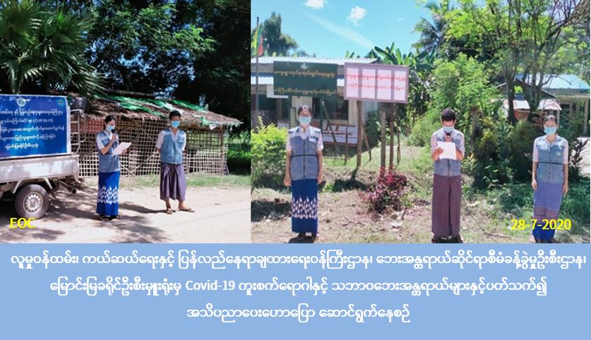 လူမှုဝန်ထမ်း၊ ကယ်ဆယ်ရေးနှင့် ပြန်လည်နေရာချထားရေးဝန်ကြီးဌာန၊ ဘေးအန္တရာယ်ဆိုင်ရာစီမံခန့်ခွဲမှုဦးစီးဌာန၊ မြောင်းမြခရိုင်ဦးစီးမှူးရုံးမှ တာဝန်ရှိသူများသည် (၂၈-၇-၂၀၂၀) ရက်နေ့ ၊ မနက် (၀၉း၃၀) နာရီအချိန်မှစ၍ နေ့လည် (၁၂:၀၀) နာရီအချိန်အထိ မြောင်းမြခရိုင်၊ အိမ်မဲမြို့နယ်၊ ကံကြီးဒေါင့်ကုန်းကျေးရွာ၊ တောင်ယာကုန်းကျေးရွာ၊ တောင်စုကျေးရွာ၊ ကျောက်ဝိုင်းကျေးရွာ၊ ပခုက္ကူစုကျေးရွာတို့တွင် လတ်တလောနိုင်ငံအသီးသီးတွင် ကူးစက်ပြန့်ပွားလျက်ရှိသော Covid-19 ကူးစက်ရောဂါ ထိန်းချုပ်ရေးနှင့် အရေးပေါ်တုန့်ပြန်ရေးကော်မတီမှ (၃၀-၆-၂၀၂၀) ရက်နေ့အထိ ထုတ်ပြန်ပြီးဖြစ်သည့် တားမြစ်မိန့်နှင့် ညွှန်ကြားချက်များအားလည်းကောင်း ရာသီအလိုက်ဖြစ်ပွားတက်သော သဘာဝဘေးအန္တရာယ်များနှင့် ပတ်သတ်သည့် သဘာဝဘေးအသိပညာပေးခြင်းတို့အားလည်းကောင်း အများပြည်သူများသိရှိလိုက်နာရန် ကွင်းဆင်းလှည့်လည်၍ အသိပညာပေးခြင်း လုပ်ငန်းများ ပြုလုပ်ဆောင်ရွက်ခဲ့ပါကြောင်း သတင်းရရှိပါသည်။