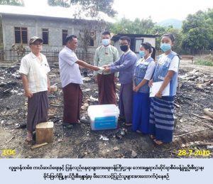 လူမှုဝန်ထမ်း၊ ကယ်ဆယ်ရေးနှင့် ပြန်လည်နေရာချထားရေးဝန်ကြီးဌာန၊ ဘေးအန္တရာယ်ဆိုင်ရာ စီမံခန့်ခွဲမှုဦးစီးဌာန၊ မိုင်းဖြတ်မြို့နယ်ဦးစီးမှူးရုံးမှ တာဝန်ရှိသူများသည် မိုင်းဖြတ်မြို့နယ်၊ ဈေးတန်း (ကွက်သစ်) ရပ်ကွက်၌ (၂၆-၇-၂၀၂၀) ရက်နေ့တွင် ဖြစ်ပွားခဲ့သော မီးဘေးကြောင့် ဘေးသင့် လူနေအိမ် (၁) လုံး၊ အိမ်ထောင်စု (၁) စုအတွက် အိမ်ဆောက်ပစ္စည်းဖိုးငွေ (၂၀၀,၀၀၀/-)ကျပ်၊ ကယ်ဆယ်ရေးပစ္စည်း (၂၂) မျိုးပါပုံး (၁)ပုံးနှင့် လူဦးရေ (၅) ဦးအတွက် ဆန်ရိက္ခာဖိုးငွေ (၁၀၅၀၀/-) ကျပ်၊ စုစုပေါင်းထောက်ပံ့ငွေ (၂၁၀၅၀၀/-)ကျပ်တို့အား (၂၈-၇-၂၀၂၀) ရက်နေ့တွင် သက်ဆိုင်ရာ မြို့နယ်အထွေထွေအုပ်ချုပ်ရေးဦးစီးဌာန၊ မြို့နယ်ပြန်ဆက်ဦးစီးမှူး၊ ရပ်ကွက် အုပ်ချုပ်ရေးမှူး တို့နှင့်အတူ ဘေးသင့်ပြည်သူများလက်ဝယ်အရောက် သွားရောက်ထောက်ပံ့ ပေးအပ်ခဲ့ကြောင်း သတင်းရရှိပါသည်။