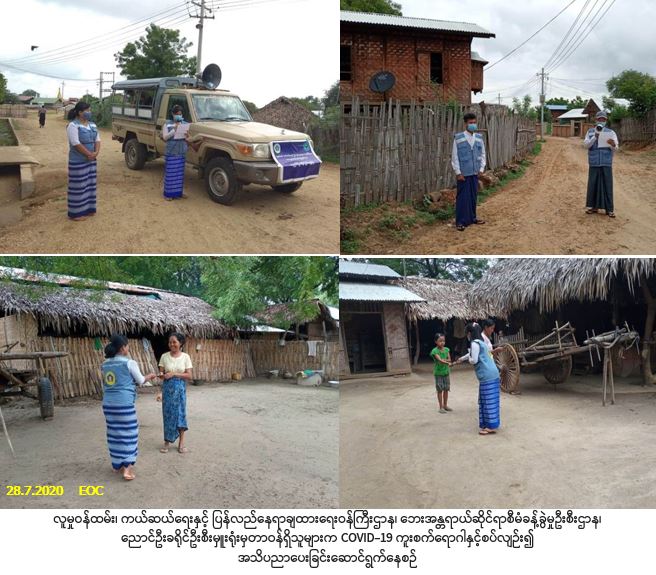 လူမှုဝန်ထမ်း၊ ကယ်ဆယ်ရေးနှင့် ပြန်လည်နေရာချထားရေးဝန်ကြီးဌာန၊ ဘေးအန္တရာယ်ဆိုင်ရာစီမံခန့်ခွဲမှုဦးစီး ဌာန၊ ညောင်ဦးခရိုင်ဦးစီးမှူးရုံးမှတာဝန်ရှိသူများသည် (၂၈-၇-၂၀၂၀)ရက်နေ့တွင် ညောင်ဦးခရိုင်အတွင်းရှိ ကျေးရွာစုစုပေါင်း (၁၇) ရွာတို့၌ COVID-19 ကူးစက်ရောဂါနှင့်စပ်လျဉ်း၍ ဆောင်ရန်/ရှောင်ရန်အချက်များ၊ မိုးရာသီတွင်ဖြစ်ပွားလေ့ရှိသည့် သဘာဝဘေးအန္တရာယ်များနှင့်စပ်လျဉ်း၍ ဆောင်ရန်/ရှောင်ရန်အချက်များကို Handspeaker ၊ Loudspeaker တို့ဖြင့် လှည့်လည်အသိပညာပေးနှိုးဆော်ခဲ့ပါကြောင်း သတင်းရရှိပါသည်။