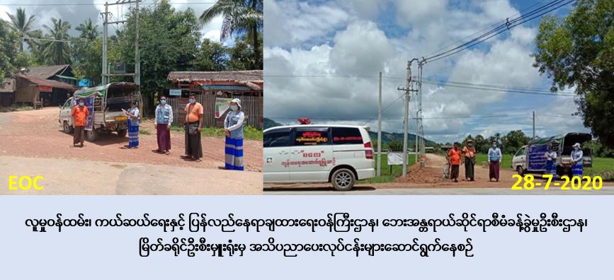 လူမှုဝန်ထမ်း၊ ကယ်ဆယ်ရေးနှင့် ပြန်လည်နေရာချထားရေးဝန်ကြီးဌာန၊ ဘေးအန္တရာယ်ဆိုင်ရာ စီမံခန့်ခွဲမှုဦးစီးဌာန၊ မြိတ်ခရိုင်ဦးစီးမှူးရုံးမှ တာဝန်ရှိသူများသည် (၂၈-၇-၂၀၂၀)ရက်နေ့တွင် မြိတ်ဂဝေသီစေတနာရှင် လူမှုကူညီရေးအသင်း ပရဟိတအဖွဲ့နှင့် ချစ်ကြည်ရေးပရဟိတအဖွဲ့တို့ ပူးပေါင်း၍ မဇောကျေးရွာအုပ်စုမှ ကြေးနန်းတိုင်၊ မြင်သာ၊ ပြင်ကြီး၊ ဝိုင်းတောင်၊ လက်မဲ၊ သကန်ကရင်၊ သကန်မြန်မာ၊ ဘန်မဲ့၊ ခုံမော်အရှေ့ကမ်းကျေးရွာတို့တွင် COVID 19 အသက်ရှူ လမ်းကြောင်းဆိုင်ရာ ရောဂါနဲ့ပတ်သက်၍ အများပြည်သူသိရှိလိုက်နာနိုင်ရန် ကျန်းမာရေးနှင့် အားကစားဝန်ကြီးဌာနမှ ထုတ်ပြန်ထားသော အသိပေးကြေငြာချက်များနှင့် မိုးကြိုးဘေး၊ ရေဘေး၊ မြေပြိုဘေးနှင့်စပ်လျဥ်း၍ ဌာနမှထုတ်ပြန်ထားသည့် လက်ကမ်းစာစောင်ပါ အချက် အလက်များ၊ သဘာဝဘေးအသိပညာပေးခြင်းများ ဆောင်ရွက်ခဲ့ပါကြောင်း သတင်းရရှိပါသည်။