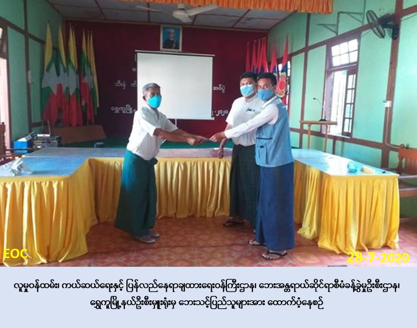 လူမှုဝန်ထမ်း၊ ကယ်ဆယ်ရေးနှင့် ပြန်လည်နေရာချထားရေးဝန်ကြီးဌာန၊ ဘေးအန္တရာယ်ဆိုင်ရာ စီမံခန့်ခွဲမှုဦးစီးဌာန၊ ရွှေကူမြို့နယ်ဦးစီးမှူးရုံးမှ တာဝန်ရှိသူများသည် ရွှေကူမြို့နယ်၊ ဆင်တပ် ကျေးရွာ၌ (၂၄-၇-၂၀၂၀) ရက်နေ့တွင် ဧရာဝတီမြစ်ရေမြင့်တက်လာမှုကြောင့် ဆင်တပ်ဘုန်း တော်ကြီးကျောင်းရှိ ယာယီပြောင်းရွှေ့အိမ်ထောင်စု (၂) စု၊လူဦးရေ (၁၀) ဦးတို့အား အိမ်ထောင်စု (၁) စုလျှင်ဆပ်ပြာ (၁) တောင့်နှုန်းဖြင့် စုစုပေါင်းအိမ်ထောင်စု (၂) စုအတွက် ဆပ်ပြာ(၂)တောင့်၊ လူ(၁)ဦးလျှင် အဝတ်Mask(၁)ခုနှုန်းဖြင့် လူဦးရေစုစုပေါင်း (၁၀)ဦးအတွက် အဝတ် Masks (၁၀)ခုနှင့် (၁)ဦးလျင် (၇)ရက်စာဆန်ဖိုးငွေ (၂၁၀၀/-) ကျပ်နှုန်းဖြင့် စုစုပေါင်းလူဦးရေ (၁၀)ဦးတို့အတွက် (၂၁၀၀ဝ/-)ကျပ်အား (၂၈-၇-၂၀၂၀)ရက်နေ့၊ နံနက် (၁၀:၃ဝ) နာရီအချိန်တွင် ထောက်ပံ့ခဲ့ကြောင်း သတင်းရရှိပါသည်။