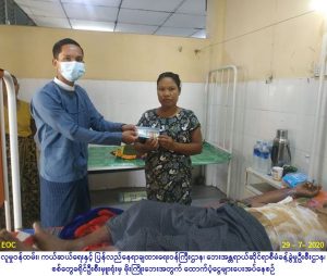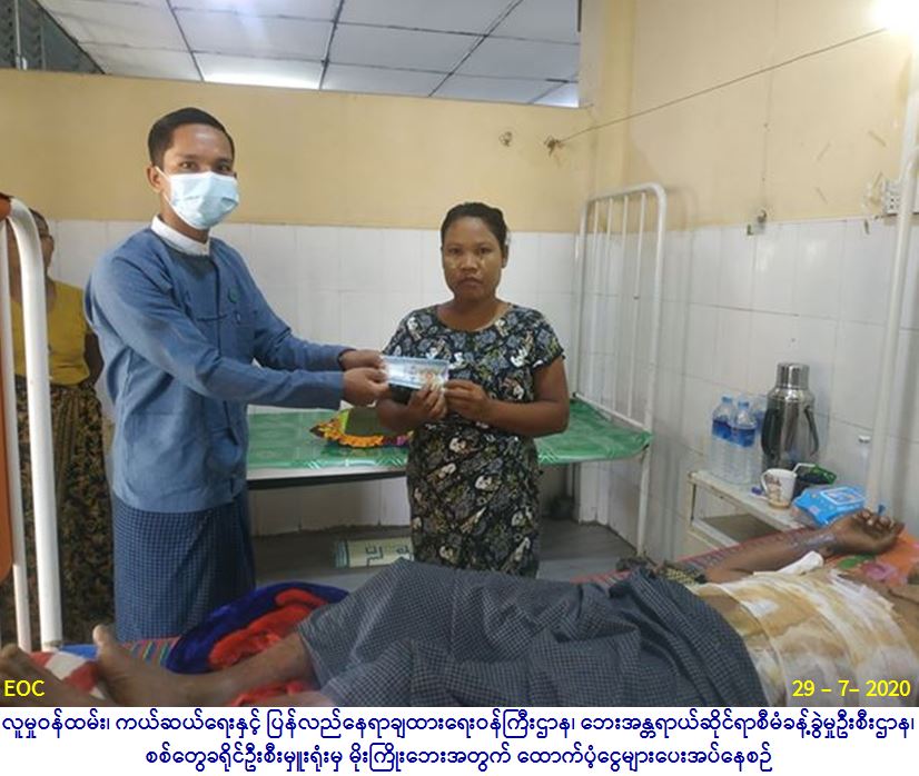 လူမှုဝန်ထမ်း၊ ကယ်ဆယ်ရေးနှင့် ပြန်လည်နေရာချထားရေး ဝန်ကြီးဌာန၊ ဘေးအန္တရာယ်ဆိုင်ရာစီမံခန့်ခွဲမှုဦးစီးဌာန၊ ရခိုင်ပြည်နယ်၊ စစ်တွေခရိုင်၊ စစ်တွေမြို့နယ်၊ ညိုရောင်ချောင်းကျေးရွာ၌ မိုးကြိုးထိမှန်မှုကြောင့် စစ်တွေပြည်သူ့ဆေးရုံကြီးသို့ ဆေးကုသမှုခံယူ လျက်ရှိသည့် ဒဏ်ရာရလူနာ(၁)ဦးအတွက် ဒဏ်ရာရထောက်ပံ့ငွေ (၅၀၀၀၀/-)ကျပ် အား (၂၉.၇.၂၀၂၀)ရက်နေ့တွင် ထောက်ပံ့ပေး အပ်ခဲ့ပါကြောင်း သတင်းရရှိပါသည်။
