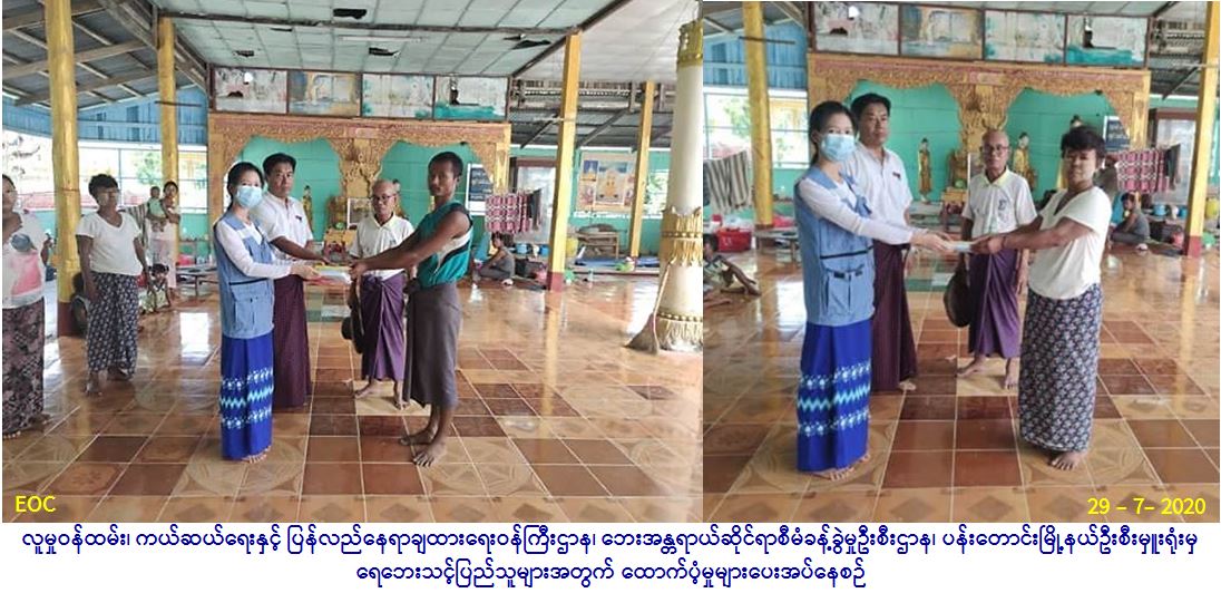 လူမှုဝန်ထမ်း၊ ကယ်ဆယ်ရေးနှင့် ပြန်လည်နေရာချထားရေး ဝန်ကြီးဌာန၊ ဘေးအန္တရာယ်ဆိုင်ရာစီမံခန့်ခွဲမှုဦးစီးဌာန၊ ပန်းတောင်း မြို့နယ်ဦးစီးမှူးရုံးမှ တာဝန်ရှိသူများသည် ထုံးဘိုကျေးရွာအုပ်စု၊ ထုံးဘိုကျေးရွာ (၂၈.၇.၂၀၂၀)ရက်နေ့ ဧရာဝတီမြစ်ရေ ဝင်ရောက်မှု ကြောင့် ရွှေ့ပြောင်းခဲ့ရသော အိမ်ထောင်စု(၄)စုမှ လူဦးရေ (၁၇)ဦးအတွက် ဆန်ရိက္ခာဖိုး (၇)ရက်စာထောက်ပံ့ငွေ (၃၅၇၀၀/-)ကျပ်၊ ဆပ်ပြာ (၄)တောင့် ၊ Mask (၈)ခုတို့အား (၂၉.၇.၂၀၂၀)ရက်နေ့၊ (၁၃:၂၀)နာရီအချိန်တွင် ထုံးဘိုကျေးရွာ၊ မြသိန်းတန်ဘုရားတွင် သွားရောက်ထောက်ပံ့ပေးအပ်ခဲ့ပါကြောင်း သတင်းရရှိပါသည်။
