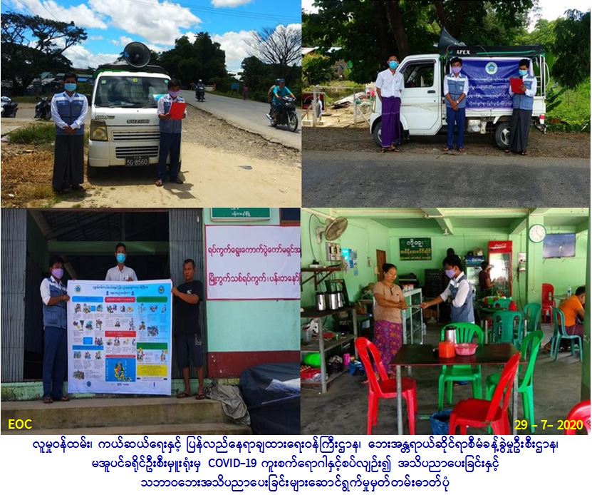 လူမှုဝန်ထမ်း၊ ကယ်ဆယ်ရေးနှင့်ပြန်လည်နေရာချထားရေးဝန်ကြီးဌာန၊ ဘေးအန္တရာယ်ဆိုင်ရာစီမံခန့်ခွဲမှုဦးစီးဌာန၊ မအူပင်ခရိုင် ဦးစီးမှူးရုံးမှ တာဝန်ရှိသူများသည် (၂၉-၇-၂၀၂၀) ရက်နေ့တွင် ပန်းတနော်မြို့ပေါ် တောင်ပိုင်းရပ်ကွက်၌ COVID-19 ရောဂါကူး စက်ပျံ့နှံ့မှု ဒုတိယလှိုင်းမဖြစ်ပွားစေရန် အများပြည်သူအလွယ်တကူ သိရှိလိုက်နာဆောင်ရွက်ရန်အချက်များနှင့် မိုးရာသီတွင် ဖြစ်ပွားလေ့ရှိသည့် သဘာဝဘေးအန္တရာယ်များကို ကြိုတင်ပြင်ဆင်ရေး အသိပေးချက်များကို လှည်လည်ဟောပြောခြင်း၊ ဘေး (၈)မျိုးလက်ကမ်းစာစောင်များ ဝေငှခြင်းနှင့် ဗီနိုင်းပိုစတာဖြန့်ဝေခြင်းများ ဆောင်ရွက်ခဲ့ပါကြောင်း သတင်းရရှိပါသည်။