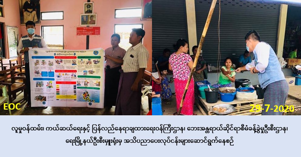 လူမှုဝန်ထမ်း၊ ကယ်ဆယ်ရေးနှင့် ပြန်လည်နေရာချထားရေးဝန်ကြီးဌာန၊ ဘေးအန္တရာယ်ဆိုင်ရာ စီမံခန့်ခွဲမှုဦးစီးဌာန၊ ရေးမြို့နယ်ဦးစီးမှူးရုံးမှ တာဝန်ရှိသူများသည် (၂၉-၇-၂၀၂၀) ရက်နေ့၊ (၁၀:၀၀) နာရီအချိန်မှ (၁၄:၀၀) နာရီအချိန်အထိ မွန်ပြည်နယ်၊ မော်လမြိုင်ခရိုင်၊ ရေးမြို့နယ်၊ အစင်ကျေးရွာ၊ ဓမင်းဆိပ်ကြီးကျေးရွာနှင့် ဓမင်းဆိပ်လေးကျေးရွာတို့တွင် COVID-19 ရောဂါ ကူးစက်ပြန့်နှံ့မှု မဖြစ်ပွားစေရေးနှင့် မိုးရာသီကာလအတွင်း ဖြစ်ပွားလေ့ရှိသည့် မိုးကြိုးဘေး၊ မုန်တိုင်းဘေး၊ ရေဘေး၊ မြေပြိုဘေးအန္တရာယ်များ ကြိုတင်ပြင်ဆင်ရေး အသိပညာပေးခြင်းနှင့် လက်ကမ်းစာစောင် ဖြန့်ဝေပေးခြင်းများဆောင်ရွက်ခဲ့ပြီး မုန်တိုင်းဘေးပိုစတာအား အုပ်ချုပ်ရေး မှူးကို ပေးအပ်ခြင်းများအား ဆောင်ရွက်ခဲ့ပါကြောင်း သတင်းရရှိပါသည်။