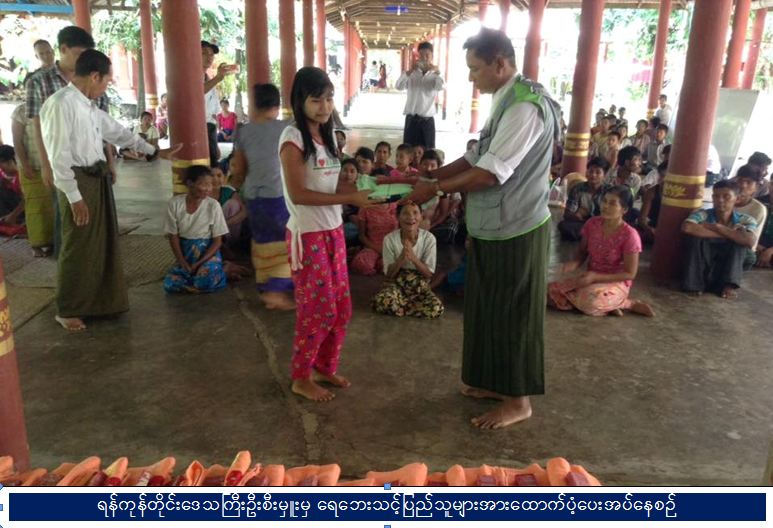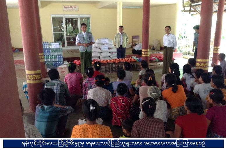 ရန်ကုန်တိုင်းဒေသကြီး၊ အဖျောက်မြို့တွင် ဧရာဝတီမြစ်ရေကြီးမှုကြောင့် ယာယီ ပြောင်းရွှေ့ ထားသည့် ပြည်သူများအား ကယ်ဆယ်ရေးစခန်းများတွင် အိမ်ထောင်စုအလိုက် ြဖန့်ခွဲထားရှိလျက် ရှိပါသည်။ အင်းဝကျောင်းတိုက်တွင် ရေပေါ်သောင်အုပ်စု၊ အလယ်ကင်းရွာမှ အိမ်ထောင်စု (၅၁) လူဦးရေ (၁၇၈) ဦး၊ ပခန်းကြီးကျောင်းတိုက်တွင် အလယ်သင်းရွာမှ အိမ်ထောင်စု (၄၇) ၊ လူဦးရေ (၁၂၄) ဦး၊ မြို့ဦးရိပ်သာကျောင်းတိုက်တွင် ရေပြန်ကြီးရွာ၊ ချောင်းကြီးရွာ၊ ရေလဲရွာမှ အိမ်ထောင်စု (၈၅)၊ လူဦးရေ (၂၂၉) ဦး၊ ငါးလာချောင်း ကျောင်းနှင့်ဓမ္မာရုံတွင် ငါးလာချောင်းကျေးရွာအုပ်စုမှ အိမ်ထောင်စု (၄၂) ၊ လူဦးရေ (၂၀၇) ဦး၊ ပန်းတုန်းပိတ်ဘုန်းတော်ကြီးကျောင်းတွင် ပန်းတုန်းပိတ်ရွာ မှ အိမ်ထောင်စု (၃၄)၊ လူဦးရေ (၁၃၅) ဦးနှင့် ချမ်းမြေ့ရိပ်သာကျောင်းတွင် မအူကုန်းရွာ၊ ရေပြန်ရွာများမှ အိမ်ထောင်စု (၄၂) ၊ လူဦးရေ (၁၂၁) ဦး၊ (၇-၈-၂၀၁၆) ရက်နေ့အထိ စုစုပေါင်းအိမ်ထောင်စု (၃၀၁)စု၊ လူဦးရေစုစုပေါင်း (၉၉၄) ဦးတို့အတွက် ကယ်ဆယ်ရေးနှင့် ပြန်လည်နေရာချထားရေးဦးစီးဌာန၊ ရန်ကုန်တိုင်းဒေသကြီးဦးစီးမှူးရုံးမှ အရာထမ်း၊ အမှုထမ်းများသည် ကယ်ဆယ်ရေးစခန်းများသို့ သွားရောက်ပြီး ရေဘေးသင့်ပြည်သူများအား အိမ်ထောင်စု (၃၀၁)စုစာ ကယ်ဆယ်ရေးပစ္စည်း (၄)မျိုး ၊ လူဦးရေ (၉၉၄) ဦးအတွက် ဆန်ရိက္ခာ (၃)ရက်စာတန်ဖိုးငွေကျပ် (၈၉၄၆၀၀) နှင့် ခေါက်ဆွဲခြောက် ဖာ(၆၀)၊ စားဆီ (၃)ဖာတို့အား (၇-၈-၂၀၁၆)ရက်နေ့တွင် ရေဘေးသင့်ပြည်သူများ၏ လက်ဝယ် အရောက် ထောက်ပံ့ပေးခဲ့ပါကြောင်း သတင်းရရှိပါသည်။
