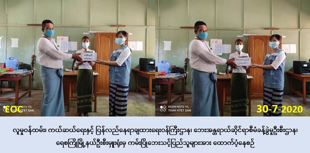 လူမှုဝန်ထမ်း၊ ကယ်ဆယ်ရေးနှင့် ပြန်လည်နေရာချထားရေးဝန်ကြီးဌာန၊ ဘေးအန္တရာယ်ဆိုင်ရာ စီမံခန့်ခွဲမှုဦးစီးဌာန၊ ရေစကြိုမြို့နယ်ဦးစီးမှူးရုံးမှ တာဝန်ရှိသူများသည် ရေစကြိုမြို့နယ်၊ အောင်ပန်းချောင်းကျေးရွာအုပ်စု၊ အောင်ပန်းချောင်းကျေးရွာတွင် (၂၉-၇-၂၀၂၀) ရက်နေ့၊ (၁၂:၀၀)နာရီအချိန်၌ ချင်းတွင်းမြစ်ရေတိုက်စား၍ ကမ်းပါးပြိုကျမှုကြောင့် ကြိုတင်ဖျက်သိမ်း ပြောင်းရွှေ့ လူနေအိမ်(၂)လုံး၊ အိမ်ထောင်စု(၂)စု၊ လူဦးရေ(၈)ဦးတို့အတွက် အိမ်ဆောက် ပစ္စည်းဖိုးထောက်ပံ့ငွေ(၂၀၀,၀၀ဝ/-)ကျပ်၊ ဆန်ရိက္ခာဖိုးထောက်ပံ့ငွေ(၁၆,၈၀ဝ/-)ကျပ်၊ စုစုပေါင်း ထောက်ပံ့ငွေ (၂၁၆၈၀ဝ/-) ကျပ်အား (၃၀-၇-၂၀၂၀)ရက်နေ့၊ (၁၄:၀၀)နာရီအချိန်တွင် ရေစကြို မြို့နယ်အထွေထွေအုပ်ချုပ်ရေးရုံး၌ မြို့နယ်အထွေထွေအုပ်ချုပ်ရေးရုံးမှ တာဝန်ရှိသူနှင့်အတူ ကျေးရွာအုပ်ချုပ်ရေးမှူးလက်ဝယ်အရောက် ထောက်ပံ့ပေးအပ်ခဲ့ပါကြောင်း သတင်းရရှိပါသည်။