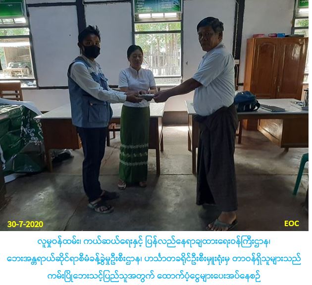 လူမှုဝန်ထမ်း၊ ကယ်ဆယ်ရေးနှင့် ပြန်လည်နေရာချထားရေးဝန်ကြီးဌာန၊ ဘေးအန္တရာယ်ဆိုင်ရာစီမံခန့်ခွဲမှုဦးစီးဌာန၊ ဟင်္သာတခရိုင်ဦးစီးမှူးရုံးမှ တာဝန်ရှိသူများသည် (၂၉-၇-၂၀၂၀) ရက်နေ့၌ မြန်အောင်မြို့နယ်၊ ရွှေကျင်အုပ်စု၊ ဘုရားလှကျေးရွာတွင် ဖြစ်ပွားခဲ့သော ကမ်းပြိုဘေးသင့် အိမ်ခြေ (၂) လုံးအတွက် အိမ်ဆောက်ပစ္စည်းဖိုးထောက်ပံ့ငွေ (၂၀၀၀၀ဝ/-) ကျပ်၊ လူဦးရေ (၁၀) ဦး တို့အတွက် ဆန်ရိက္ခာ (၇) ရက်စာဖိုးထောက်ပံ့ငွေ (၂၁၀၀ဝ/-) ကျပ်၊ စုစုပေါင်း ကယ်ဆယ်ရေးထောက်ပံ့ငွေ (၂၂၁၀၀၀/-) ကျပ်ကို ဘေးသင့်ပြည်သူလက်ဝယ်အရောက်(၃၀-၇-၂၀၂၀) ရက်နေ့ (၁၁:၀၀) နာရီချိန်တွင် ထောက်ပံ့ပေးအပ်ခဲ့ကြောင်း သတင်းရရှိပါသည်။
