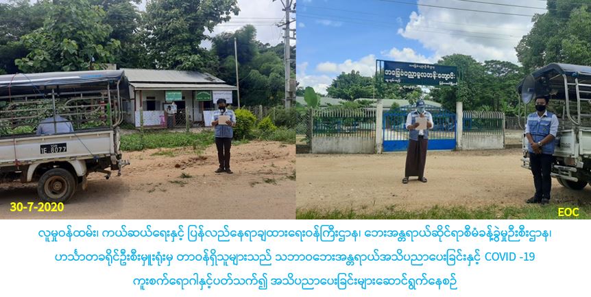 လူမှုဝန်ထမ်း၊ ကယ်ဆယ်ရေးနှင့် ပြန်လည်နေရာချထားရေးဝန်ကြီးဌာန၊ ဘေးအန္တရာယ်ဆိုင်ရာစီမံခန့်ခွဲမှုဦးစီးဌာန၊ ဟင်္သာတခရိုင်ဦးစီးမှူးရုံးမှ တာဝန်ရှိသူများသည် (၃၀-၇-၂၀၂၀) ရက်နေ့တွင် ဟင်္သာတမြို့နယ်၊ ဒူးယားမြို့ (အမှတ်(၁)၊ အမှတ်(၂)၊ အမှတ်(၃))ရပ်ကွက်တို့တွင် နံနက် (၀၈:၀၀)နာရီအချိန်မှ (၁၀:၃၀)နာရီအချိန်ထိ လည်းကောင်း၊ မြန်အောင်မြို့နယ်၊ ထူအုပ်စု၊ (ဂျို့ကုန်း ၊ကွမ်းခြံကုန်း၊ မကျီးကုန်း၊ အလယ်စု၊ မင်းကုန်း၊ ဂျမ်းကုန်း) ကျေးရွာတို့တွင် (၁၁:၀၀)နာရီအချိန်မှ(၁၄:၀၀)နာရီအချိန်ထိ လည်းကောင်း၊ ကျန်းမာရေးနှင့်အားကစားဝန်ကြီးဌာနမှ ထုတ်ပြန်ထားသော Covid-19 ကူးစက်မှု ဒုတိယလှိုင်းမဖြစ်စေရန် (ဒုတိယအကြိမ်) အသိပညာပေးခြင်းလုပ်ငန်းများနှင့် ဧရာဝတီတိုင်းဒေသကြီး Covid -19 ထိန်းချုပ်ရေးနှင့် အရေးပေါ် တုံ့ပြန်ရေးကော်မတီမှ (၁၄-၇-၂၀၂၀)ရက်နေ့အထိ ထုတ်ပြန်ပြီးဖြစ်သည့် တားမြစ်မိန့်နှင့် ညွန်ကြားချက်အားလည်းကောင်း၊ ရာသီအလိုက်ဖြစ်ပွားတတ်သော သဘာဝဘေးများအန္တရာယ်များနှင့်ပတ်သက်သည့် သဘာဝဘေးအသိပညာပေးခြင်းတို့အား လည်းကောင်း၊ အများပြည်သူများသိရှိလိုက်နာရန် ကွင်းဆင်းလှည့်လှည်၍ အသိပညာပေးလုပ်ငန်းများ ပြုလုပ်ဆောင်ရွက်ခဲ့ပါ ကြောင်း သတင်းရရှိပါသည်။