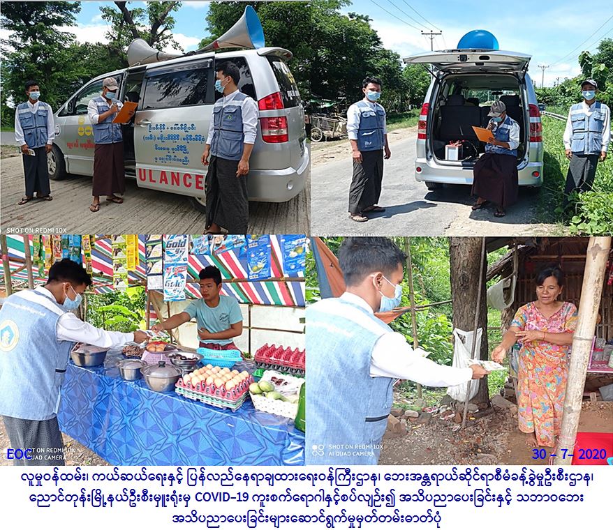 လူမှုဝန်ထမ်း၊ ကယ်ဆယ်ရေးနှင့်ပြန်လည်နေရာချထားရေးဝန်ကြီးဌာန၊ ဘေးအန္တရာယ်ဆိုင်ရာစီမံခန့်ခွဲမှုဦးစီးဌာန၊ ညောင်တုန်း မြို့နယ်ဦးစီးမှူးရုံးမှ တာဝန်ရှိသူများသည် (၃၀-၇-၂၀၂၀) ရက်နေ့တွင် ညောင်တုန်းမြို့နယ်၊ ထိပ်ဝကြီးကျေးရွာအုပ်စုအတွင်းရှိ ကျေးရွာများ၌ covid-19ကူးစက်ရောဂါ ဒုတိယလှိုင်းမဖြစ်ပွားစေရန်အတွက် ဒုတိယအကြိမ်အသိပညာပေးခြင်းနှင့် သဘာဝ ဘေးအန္တရာယ် ဆိုင်ရာဆောင်ရန်၊ ရှောင်ရန်များအားအသိပညာပေးခြင်း လုပ်ငန်းများဆောင်ရွက်ခဲ့၍ လက်ကမ်းစာစောင်များ ဖြန့်ဝေပေးခဲ့ပါကြောင်း သတင်းရရှိပါသည်။