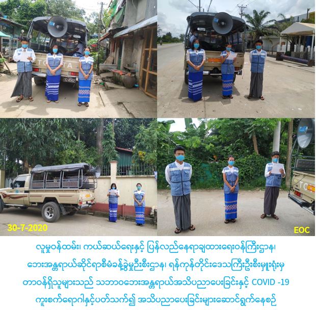 လူမှုဝန်ထမ်း၊ ကယ်ဆယ်ရေးနှင့် ပြန်လည်နေရာချထားရေးဝန်ကြီးဌာန၊ ဘေးအန္တရာယ်ဆိုင်ရာစီမံခန့်ခွဲမှုဦးစီးဌာန၊ ရန်ကုန်တိုင်းဒေသကြီးဦးစီးမှူးရုံးမှ တာဝန်ရှိသူများသည် (၃ဝ-၇-၂၀၂၀) ရက်နေ့တွင် ရန်ကုန်မြောက်ပိုင်းခရိုင်၊ ရွှေပြည်သာမြို့နယ်၊ အမှတ်(၈/၉/၁၀/၁၁/၁၂/၁၃/၁၄)ရပ်ကွက်များတွင် Covid_19 အသက်ရှူလမ်းကြောင်းဆိုင်ရာ ရောဂါနှင့်ပတ်သက်၍ အများ ပြည်သူများသိရှိလိုက်နာနိုင်ရန် ကျန်းမာရေးနှင့် အားကစားဝန်ကြီးဌာနမှ ထုတ်ပြန်ထားသော အသိပေးကြေငြာများအားနှင့် မိုးကြိုးဘေး၊ရေဘေးနှင့်စပ်လျဉ်သည့် ရှောင်ရန်/ဆောင်ရန်အချက်များနှင့်လက်ကမ်းစားစောင်များပါ အချက်အလက်များ၊ သဘာဝ ဘေးအသိပညာပေးခြင်းအား အရာထမ်း၊အမှုထမ်းများမှ ရပ်ကွက်များအတွင်း အသိပေးကြော်ငြာခြင်းများ ပြုလုပ်ခဲ့ပါကြောင်း သတင်းရရှိပါသည်။