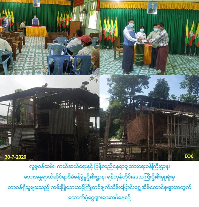 လူမှုဝန်ထမ်း၊ ကယ်ဆယ်ရေးနှင့် ပြန်လည်နေရာချထားရေးဝန်ကြီးဌာန၊ ဘေးအန္တရာယ်ဆိုင်ရာစီမံခန့်ခွဲမှုဦးစီးဌာန၊ ရန်ကုန်တိုင်းဒေသကြီးဦးစီးမှူးရုံးမှ တာဝန်ရှိသူများသည် (၂၈-၇-၂၀၂၀) ရက်နေ့နှင့် (၂၉-၇-၂၀၂၀) ရက်နေ့တို့တွင် ဧရာဝတီမြစ်ရေ တိုက်စား၍ ကမ်းပါးပြိုကျမှုအန္တရာယ်ကြောင့် နေအိမ်(၁၉)လုံး ကြိုတင်ဖျက်သိမ်းပြောင်းရွှေ့ထားပြီး အိမ်ထောင်စု(၁၉)စုမှ လူဦးရေ (၇၆)ဦးတို့အတွက် အိမ်ဆောက်ပစ္စည်းဖိုးထောက်ပံ့ငွေ(၁၉၀၀၀၀ဝ/-)ကျပ်၊ လူဦးရေ(၇၆)ဦးအတွက် ဆန်ရိက္ခာဖိုးထောက်ပံ့ငွေ (၁၅၉၆၀၀/-)ကျပ်တို့အား အထွေထွေအုပ်ချုပ်ရေးဦးစီးဌာနမှ တာဝန်ရှိသူများနှင့်အတူ ဘေးသင့်ပြည်သူများထံသို့ (၃၀-၇-၂၀၂၀)ရက်နေ့ (၁၁း၃၀)နာရီအချိန်၌ သွားရောက်၍ ထောက်ပံ့ပေးခဲ့ပါကြောင်း သတင်းရရှိပါသည်။