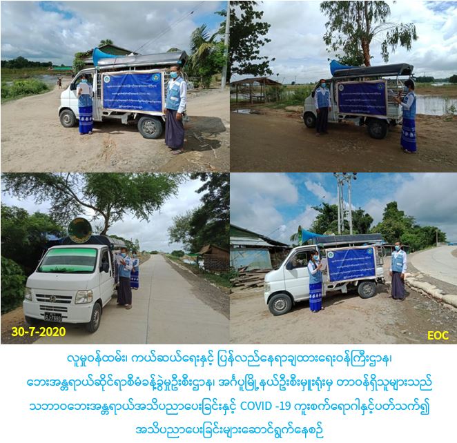လူမှုဝန်ထမ်း၊ ကယ်ဆယ်ရေးနှင့် ပြန်လည်နေရာချထားရေးဝန်ကြီးဌာန၊ ဘေးအန္တရာယ်ဆိုင်ရာစီမံခန့်ခွဲမှုဦးစီးဌာန၊ အင်္ဂပူမြို့နယ်ဦးစီးမှူးရုံးမှ တာဝန်ရှိသူများသည် (၃၀-၇-၂၀၂၀)ရက်နေ့တွင် အင်္ဂပူမြို့၊ အမှတ်(၁)ရပ်ကွက်၊ အမှတ်(၂)ရပ်ကွက်၊ အမှတ်(၃)ရပ်ကွက်တို့တွင် (ဒုတိယအကြိမ်)အဖြစ် ကျန်းမာရေးနှင့်အားကစားဝန်ကြီးဌာနမှ ထုတ်ပြန်ထားသော Covid-19 ကူးစက်မှု ဒုတိယလှိုင်း မဖြစ်စေရန် အသိပညာပေးခြင်းလုပ်ငန်းများနှင့် ဧရာဝတီတိုင်းဒေသကြီး Covid -19 ထိန်းချုပ်ရေးနှင့် အရေးပေါ်တုံ့ပြန်ရေးကော်မတီမှ (၁၄-၇-၂၀၂၀)ရက်နေ့အထိ ထုတ်ပြန်ပြီးဖြစ်သည့် တားမြစ်မိန့်နှင့် ညွန်ကြားချက်အား လည်းကောင်း၊ ရာသီအလိုက်ဖြစ်ပွားတတ်သော သဘာဝဘေးများအန္တရာယ်များနှင့် ပတ်သက်သည့် သဘာဝဘေးအသိပညာ ပေးခြင်းတို့အား အများပြည်သူများသိရှိလိုက်နာရန် ကွင်းဆင်းလှည့်လှည်၍ အသိပညာပေးလုပ်ငန်းများ ပြုလုပ်ဆောင်ရွက် ခဲ့ပါကြောင်း သတင်းရရှိပါသည်။