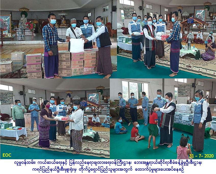 လူမှုဝန်ထမ်း၊ ကယ်ဆယ်ရေးနှင့်ပြန်လည်နေရာချထားရေးဝန်ကြီးဌာန၊ ဘေးအန္တရာယ်ဆိုင်ရာစီမံခန့်ခွဲမှုဦးစီးဌာန၊ ကရင်ပြည်နယ်ဦးစီးမှူးရုံးမှ တာဝန်ရှိသူများသည် လှိုင်းဘွဲ့မြို့နယ်၊ မြိုင်ကြီးငူအထူးဒေသရှိ တိုက်ပွဲရှောင်စခန်းများဖြစ်သည့် မြတ်ပန်း ဝတ်မှုံနှင့် အေးလင်းမြတ်ရှင် စခန်းများသို့ သွားရောက်၍ COVID-19 ကြိုတင်ကာကွယ်နိုင်ရန် အိမ်ထောင်စု(၈၇၁)၊ လူဦးရေ(၅၂၈၁)ဦးတို့အတွက် ဆပ်ပြာ(၅၂၈၁)တုံး၊ ထုံးအိတ်(၂၀)အိတ်နှင့် အဝတ်နှာခေါင်းစည်း (၁၅၀၀)ခုတို့အား (၃၁-၇-၂၀၂၀) ရက်နေ့တွင် ကရင်ပြည်နယ် လွှတ်တော်ဥက္ကဌ၊ အမျိုးသားလွှတ်တော် ကိုယ်စားလှယ်တို့နှင့်အတူ သွားရောက်ထောက်ပံ့ပေးအပ်ခဲ့ပါကြောင်း သတင်းရရှိပါသည်။