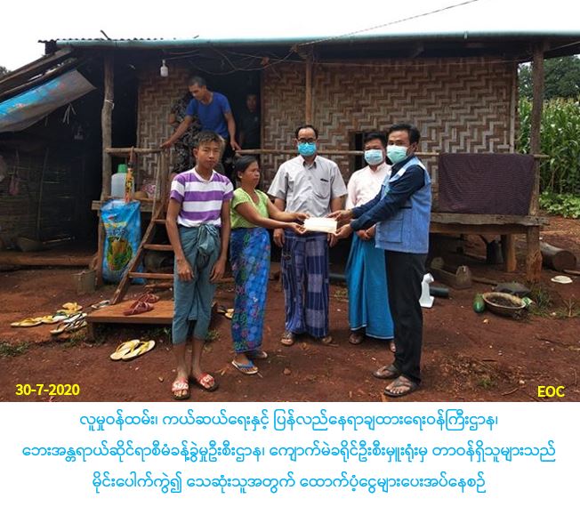 လူမှုဝန်ထမ်း၊ ကယ်ဆယ်ရေးနှင့် ပြန်လည်နေရာချထားရေးဝန်ကြီးဌာန၊ ဘေးအန္တရာယ်ဆိုင်ရာစီမံခန့်ခွဲမှုဦးစီးဌာန၊ ကျောက်မဲခရိုင်ဦးစီးမှူးရုံးမှ တာဝန်ရှိသူများသည် (၂၈-၇-၂၀၂၀) ရက်နေ့၌ ကျောက်မဲမြို့နယ်၊ ပင်ပေါကျေးရွာအုပ်စု၊ ကျောင်းကုန်း ကျေးရွာတွင် တောင်ယာလုပ်ငန်းလုပ်ကိုင်နေစဉ် မိုင်းပေါက်ကွဲ၍ သေဆုံးသူ (၁) ဦးအတွက် ထောက်ပံ့ငွေ (၃၀၀,၀၀ဝ/-) ကျပ်အား (၃၀-၇-၂၀၂၀) ရက်နေ့ (၁၄း၀၀) နာရီအချိန်တွင် ကျေးရွာအုပ်ချုပ်ရေးမှူးနှင့်အတူ ကျန်ရစ်သူမိသားစုများ လက်၀ယ်အရောက် ထောက်ပံ့ခဲ့ပါကြောင်း သတင်းရရှိပါသည်။