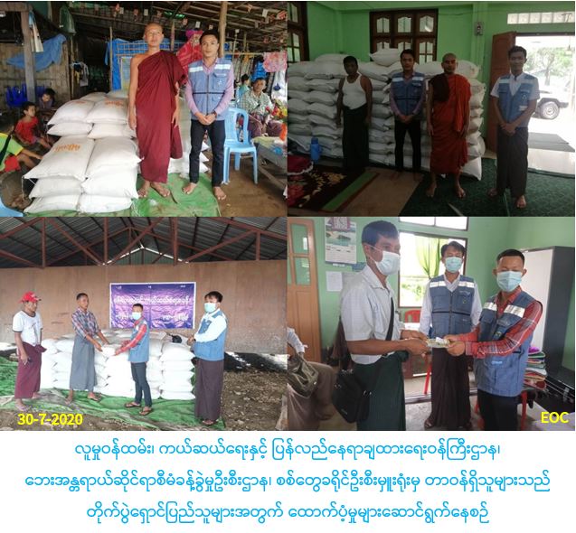 လူမှုဝန်ထမ်း၊ ကယ်ဆယ်ရေးနှင့် ပြန်လည်နေရာချထားရေးဝန်ကြီးဌာန၊ ဘေးအန္တရာယ်ဆိုင်ရာစီမံခန့်ခွဲမှုဦးစီးဌာန၊ စစ်တွေခရိုင်ဦးစီးမှူးရုံးမှ တာဝန်ရှိသူများသည် စစ်တွေမြို့အတွင်းရှိ တိုက်ပွဲရှောင်စုရပ်(၉)ခုမှ အိမ်ထောင်စု(၃၀၉)စု၊ လူဦးရေ (၁၂၇၀)ဦးတို့အတွက် ဆန်ရိက္ခါ(၁)လစာ ဆန်(၃၃၆)အိတ်၊ (၂၁)ပြည်နှင့် တိုက်ပွဲရှောင် စုရပ်(၆)ခုမှ အိမ်ထောင်စု(၈၇)စု၊ လူဦးရေ(၂၈၆)ဦးအတွက် ဆန်ရိက္ခါဖိုးငွေ(၂၅၇၄၀၀၀/-)ကျပ်အားလည်းကောင်း၊ ပုဏ္ဏားကျွန်းမြို့နယ် တိုက်ပွဲရှောင်စုရပ်(၄)ခုမှ အိမ်ထောင်စု(၆၀)စု၊ လူဦးရေ(၂၄၃)ဦးတို့အတွက် ဆန်ရိက္ခါ(၁)စာ (၇၅)အိတ်၊ (၂၂)ပြည်(၄)ဘူးနှင့် တိုက်ပွဲရှောင်စုရပ်(၆)ခုမှ အိမ်ထောင်စု(၁၆၀)စု၊ လူဦးရေ(၅၈၃)ဦးတို့အတွက် ဆန်ရိက္ခါဖိုးငွေ(၁)လစာ (၅၂၄၇၀၀၀/-)ကျပ်အားလည်းကောင်း၊ စစ်တွေမြို့နယ် အတွင်းရှိ တိုက်ပွဲရှောင် စုရပ်(၁၁)ခုမှ ထပ်တိုးရောက်ရှိလာသော တိုက်ပွဲရှောင် အိမ်ထောင်စု(၂၂၅)စု၊ လူဦးရေ(၇၆၈)တို့အတွက် ဆန်ရိက္ခါ(၂)ပတ်စာ ဆန်(၁၁၂)အိတ်အားလည်းကောင်း၊ ပုဏ္ဏားကျွန်းမြို့နယ်အတွင်းရှိ တိုက်ပွဲရှောင် စုရပ်(၁)မှ ထပ်တိုးရောက်ရှိ လာသော တိုက်ပွဲရှောင် အိမ်ထောင်စု(၇၉)စု၊ လူဦးရေ(၃၁၄)ဦးတို့အတွက် ဆန်ရိက္ခါ(၂)ပတ်စာ ဆန်(၄၅)အိတ်၊ (၁၉)ပြည်တို့အား (၂၉-၇-၂၀၂၀)ရက်နေ့နှင့်(၃၀-၇-၂၀၂၀)ရက်နေ့တို့တွင် သွားရောက်ထောက်ပံ့ခဲ့ပါကြောင်း သတင်းရရှိပါသည်။