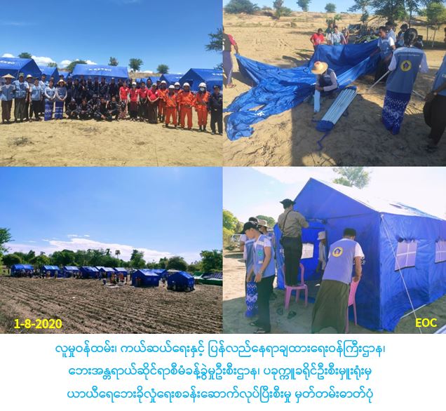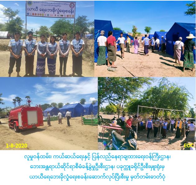 လူမှုဝန်ထမ်း၊ ကယ်ဆယ်ရေးနှင့် ပြန်လည်နေရာချထားရေးဝန်ကြီးဌာန၊ ဘေးအန္တရာယ်ဆိုင်ရာစီမံခန့်ခွဲမှုဦးစီးဌာန၊ ပခုက္ကူခရိုင်ဦးစီးမှူးရုံးမှ တာဝန်ရှိသူများသည် ဧရာဝတီမြစ်ရေမြင့်တက်မှုကြောင့် ရေဝင်ရောက်လျက်ရှိသော ကျေးရွာများမှ ပြည်သူများ ပြောင်းရွှေ့နေထိုင်နိုင်ရန်အတွက် ရေလွတ်ရာအရပ်ဖြစ်သော ပခုက္ကူမြို့နယ်၊ ရှားပင်ကျေးရွာအုပ်စု၊ ဥယျာဉ်ကျေးရွာတွင် ယာယီရေဘေးခိုလှုံရေးစခန်းအား ဌာနဆိုင်ရာမှ တာဝန်ရှိသူများ၊ NGO/ INGOများ၊ CSOများနှင့် ပူးပေါင်း၍ (၃၁-၇-၂ဝ၂ဝ) ရက်နေ့တွင် စတင်ဆောက်လုပ်ခဲ့ပြီး (၁-၈-၂ဝ၂ဝ)ရက်နေ့တွင် စခန်းဆောက်လုပ်ပြီးစီးပါကြောင်း သတင်းရရှိပါ သည်။