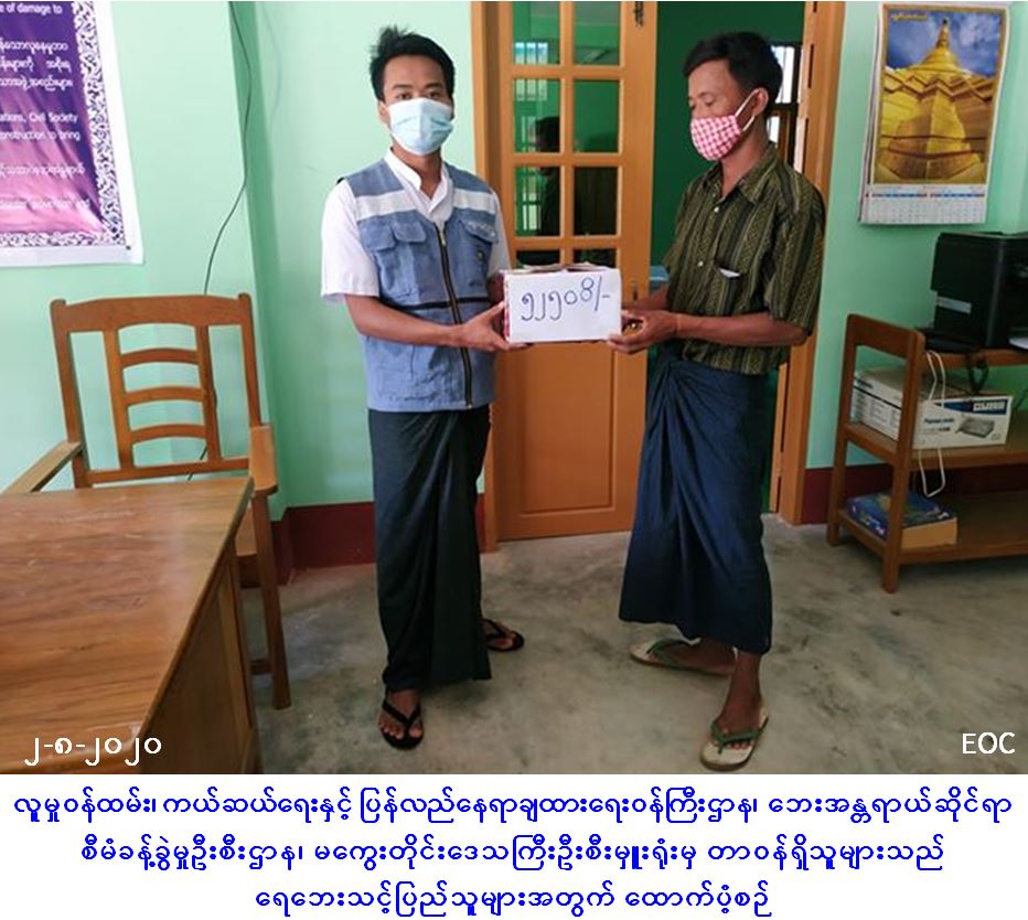 လူမှုဝန်ထမ်း၊ ကယ်ဆယ်ရေးနှင့် ပြန်လည်နေရာချထားရေးဝန်ကြီးဌာန၊ ဘေးအန္တရာယ်ဆိုင်ရာစီမံခန့်ခွဲမှုဦးစီးဌာန၊ မကွေးတိုင်းဒေသကြီးဦးစီးမှူးရုံးမှ တာဝန်ရှိသူများသည် မကွေးမြို့နယ်၊ မီးသေကျေးရွာ၌ (၁-၈-၂၀၂၀) ရက်နေ့တွင် ဧရာဝတီမြစ်ရေ မြင့်တက်လာမှုကြောင့် ရေဘေးသင့်ခဲ့သည့် အိမ်ထောင်စု (၆)စု၊ လူဦးရေ (၂၅)ဦးတို့အတွက် ဆန်ရိက္ခာဖိုးထောက်ပံ့ငွေ (၅၂၅၀ဝ/-) ကျပ်တို့အား (၂-၈-၂၀၂၀) ရက်နေ့၊ (၀၂:၀၀) နာရီအချိန်တွင် သက်ဆိုင်ရာ ကျေးရွာအုပ်ချုပ်ရေးမှူး၊ တာဝန်ရှိသူများနှင့်အတူ ဘေးသင့်ပြည်သူများထံသို့ ထောက်ပံ့ပေးအပ်ခဲ့ကြောင်း သိရှိရပါသည်။