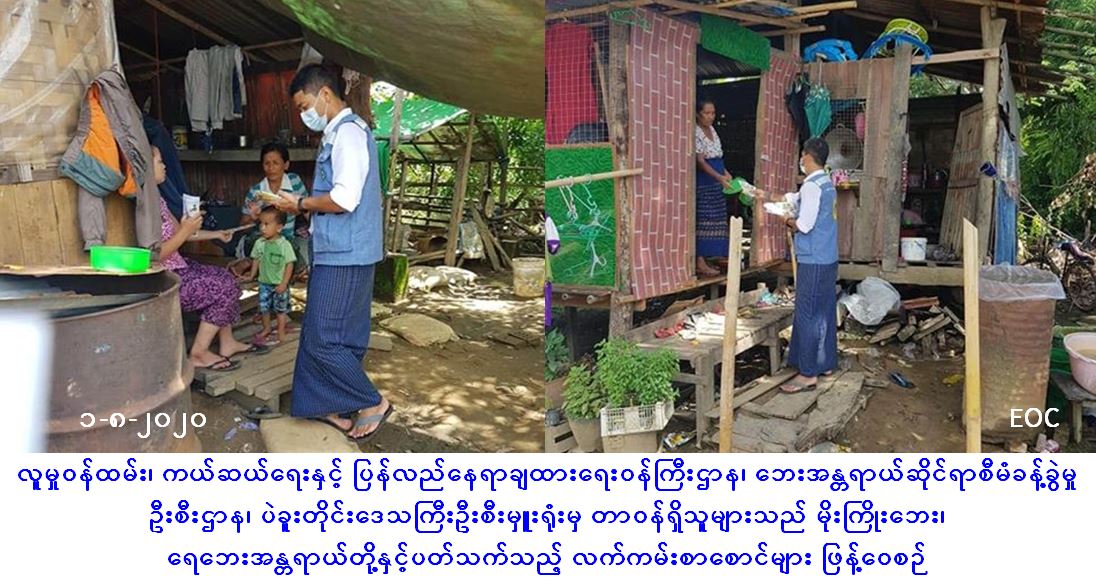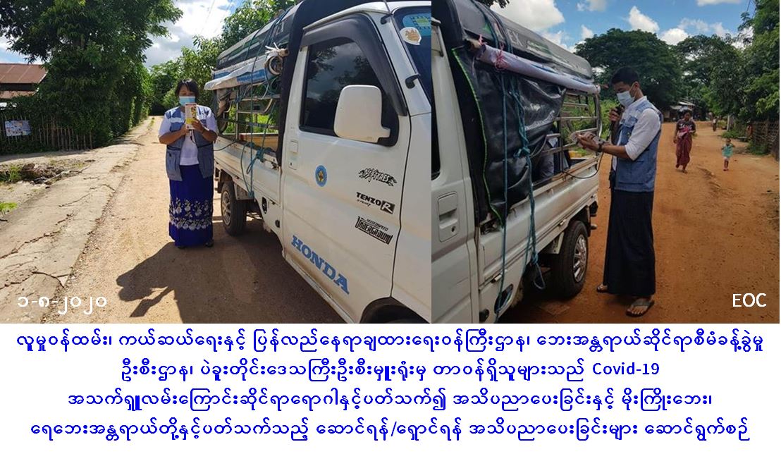 လူမှုဝန်ထမ်း၊ ကယ်ဆယ်ရေးနှင့် ပြန်လည်နေရာချထားရေးဝန်ကြီးဌာန၊ ဘေးအန္တရာယ်ဆိုင်ရာစီမံခန့်ခွဲမှုဦးစီးဌာန၊ ပဲခူးတိုင်းဒေသကြီးဦးစီးမှူးရုံးမှ တာဝန်ရှိသူများသည် (၁-၈-၂၀၂၀) ရက်နေ့တွင် မင်းလှမြို့နယ်၊ ဇီးကုန်းလေးရပ်ကွက်၊ ကန်ကြီးတန်းရပ်ကွက်၊ လမ်းမတော်ရပ်ကွက်၊ မင်းတန်းရပ်ကွက်၊ ရုံးလမ်းရပ်ကွက်၊ ဈေးချိုတန်းရပ်ကွက်၊ ပြည်တော်သာရပ်ကွက်တို့၌ (Covid-19) အသက်ရှူလမ်းကြောင်းဆိုင်ရာရောဂါနှင့်ပတ်သက်၍ အများပြည်သူများသိရှိလိုက်နာနိုင်ရန် ကျန်းမာရေးနှင့် အားကစားဝန်ကြီးဌာနမှ ထုတ်ပြန်ထားသော အသိပေးကြေညာချက်များနှင့် မိုးကြိုးဘေး၊ လေဘေး၊ ရေဘေးနှင့်စပ်လျဉ်း၍ ဦးစီးဌာနမှထုတ်ပြန်ထားသည့် လက်ကမ်းစာစောင်များပါ ဆောင်ရန်/ရှောင်ရန်များအား အသိပညာပေးခြင်းများ ပြုလုပ်ခဲ့ပြီး လက်ကမ်းစာစောင်များဝေငှခဲ့ကြောင်း သိရှိရပါသည်။
