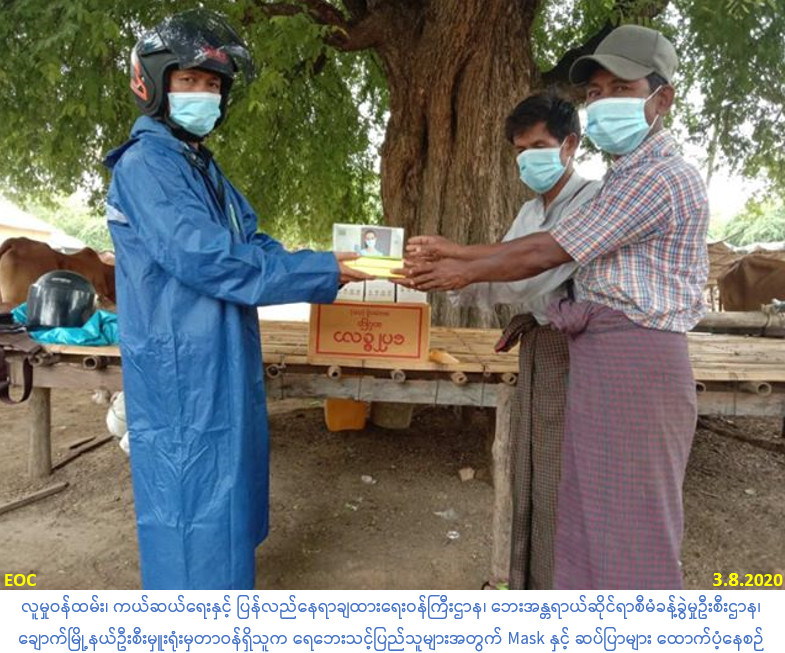 လူမှုဝန်ထမ်း၊ ကယ်ဆယ်ရေးနှင့် ပြန်လည်နေရာချထားရေးဝန်ကြီးဌာန၊ ဘေးအန္တရာယ်ဆိုင်ရာစီမံခန့်ခွဲမှုဦးစီးဌာန၊ ချောက်မြို့နယ်ဦးစီးမှူးရုံးမှ တာဝန်ရှိသူများသည် ချောက်မြို့နယ်၊ လက်ပံကျွန်းကျေးရွာအုပ်စု၊ ကျွန်းသစ်(ရ)ကျေးရွာ၌ (၃၀-၇-၂၀၂၀)ရက်နေ့၊ ဧရာဝတီမြစ်ရေ မြင့်တက်လာမှုကြောင့် ကယ်ဆယ်ရေးစခန်းများတွင် ရေဘေးရှောင်ပြောင်းရွှေ့အိမ်ထောင်စု (၇၆)စု၊ လူဦးရေ (၂၉၅)ဦးတို့အတွက် ဆပ်ပြာ(၇၆)တောင့်နှင့် Mask (၂၉၅)တို့အား (၃-၈-၂၀၂၀) ရက်နေ့၊ (၁၀:၀၀)နာရီအချိန်တွင် သက်ဆိုင်ရာကျေးရွာအုပ်ချုပ်ရေးမှူး၊ တာဝန်ရှိသူများနှင့်အတူ ဘေးသင့်ပြည်သူများထံသို့ ထောက်ပံ့ပေးအပ်ခဲ့ပါကြောင်း သတင်းရရှိပါသည်။