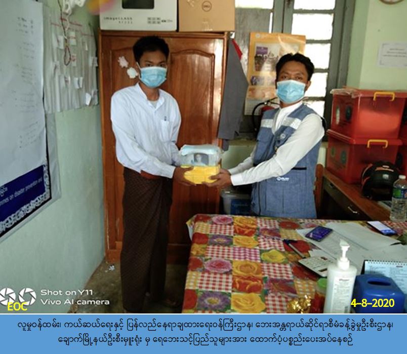 လူမှုဝန်ထမ်း၊ ကယ်ဆယ်ရေးနှင့် ပြန်လည်နေရာချထားရေးဝန်ကြီးဌာန၊ ဘေးအန္တရာယ်ဆိုင်ရာ စီမံခန့်ခွဲမှုဦးစီးဌာန၊ ချောက်မြို့နယ်ဦးစီးမှူးရုံးမှ တာဝန်ရှိသူများသည် ချောက်မြို့နယ်၊ စလေ မြို့၊ အမှတ်(၄) ရပ်ကွက်၊ စလေတောင်ကျေးရွာ၌ (၃၀-၇-၂၀၂၀) ရက်နေ့၊ ဧရာဝတီမြစ်ရေမြင့် တက်လာမှုကြောင့် ကယ်ဆယ်ရေးစခန်းများတွင် ရေဘေးရှောင်ပြောင်းရွှေ့အိမ်ထောင်စု (၁၃) စု၊ လူဦးရေ (၅၈) ဦးတို့အတွက် ဆပ်ပြာ(၁၃) တောင့်နှင့် Mask (၅၈) ခုတို့အား (၄-၈-၂၀၂၀) ရက်နေ့၊ (၁၀:၀၀) နာရီအချိန်တွင် သက်ဆိုင်ရာကျေးရွာအုပ်ချုပ်ရေးမှူး၊ တာဝန်ရှိသူများနှင့် အတူ ဘေးသင့်ပြည်သူများထံသို့ ထောက်ပံ့ပေးအပ်ခဲ့ပါကြောင်း သတင်းရရှိပါသည်။