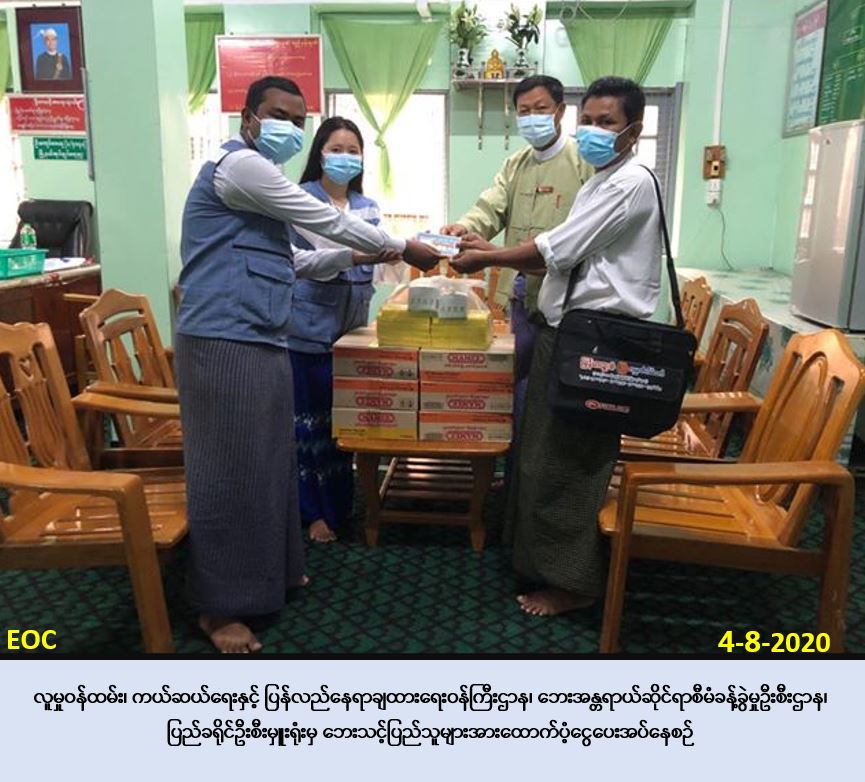 လူမှုဝန်ထမ်း၊ ကယ်ဆယ်ရေးနှင့် ပြန်လည်နေရာချထားရေးဝန်ကြီးဌာန၊ ဘေးအန္တရာယ်ဆိုင်ရာ စီမံခန့်ခွဲမှုဦးစီးဌာန၊ ပြည်ခရိုင်ဦးစီးမှူးရုံးမှ တာဝန်ရှိသူများသည် (၂-၈-၂၀၂၀) ရက်နေ့တွင် ပြည်ခရိုင်၊ ပြည်မြို့နယ်၊ ကုန်သာလင်းကျေးရွာအုပ်စု၌ ဖြစ်ပွားခဲ့သော ရေဘေးသင့်ရွှေပြောင်း အိမ်ထောင်စု (၃၂) စုအား ဆန်ရိက္ခာဖိုးထောက်ပံ့ငွေ (၃၀၆,၆၀၀/-) ကျပ်၊ဆပ်ပြာ (၃၂) တောင့်၊ ခေါက်ဆွဲခြောက် (၃၂၀) ထုပ်နင့် Surgical Mask (၂၉၂)ခုတို့အား (၄-၈-၂၀၂၀)ရက်နေ့ (၁၂:၀၀) နာရီအချိန်တွင် ဘေးသင့်ပြည်သူများ လက်၀ယ်အရောက် သွားရောက် ထောက်ပံ့ခဲ့ကြောင်း သတင်းရရှိပါသည်။