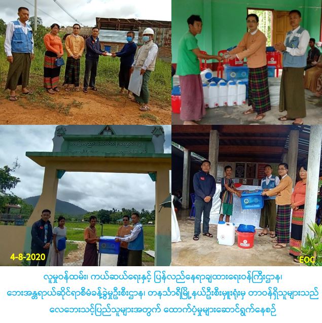 လူမှုဝန်ထမ်း၊ ကယ်ဆယ်ရေးနှင့် ပြန်လည်နေရာချထားရေးဝန်ကြီးဌာန၊ ဘေးအန္တရာယ်ဆိုင်ရာစီမံခန့်ခွဲမှုဦးစီးဌာန၊ တနင်္သာရီမြို့နယ်ဦးစီးမှူးရုံးမှ တာဝန်ရှိသူများသည် (၂-၈-၂၀၂၀) ရက်နေ့နှင့် (၃-၈-၂၀၂၀) ရက်နေ့တို့တွင် တနင်္သာရီမြို့နယ်၊ မော်တုန်းကျေးရွာအုပ်စု၊ ဇဝဲကျေးရွာအုပ်စု၊ တမုတ်ချုံးကျေးရွာအုပ်စု၊ ပဝကျေးရွာအုပ်စု၊ တကူကျေးရွာအုပ်စုနှင့် သာရဘွင် ကျေးရွာအုပ်စုများတွင် လေပြင်းတိုက်ခတ်မှုကြောင့် ပြိုကျပျက်စီးခဲ့သည့် အိမ်ခြေ (၁၄) လုံးအတွက် အိမ်ဆောက်ပစ္စည်းဖိုး ထောက်ပံ့ငွေ (၁၄၀၀၀၀၀/-)ကျပ်၊ လူဦးရေ (၅၉) ဦးအတွက် ဆန်ရိက္ခါ(၇)ရက်စာဖိုးထောက်ပံ့ငွေ (၁၂၃၉၀၀/-)ကျပ်၊ ကယ်ဆယ်ရေးပစ္စည်း(၁၇)မျိုးပါ(၁၄)ပုံးနှင့် တစ်စိတ်တစ်ပိုင်းပျက်စီးအိမ်ခြေ (၆)လုံးအတွက် အိမ်ဆောက်ပစ္စည်းဖိုးထောက်ပံ့ ငွေ (၄၅၀၀၀၀/-)ကျပ်၊ လူဦးရေ (၃၂) ဦးအတွက် ဆန်ရိက္ခါ(၇)ရက်စာဖိုးထောက်ပံ့ငွေ (၆၇၀၀၀/-)ကျပ် စုစုပေါင်းထောက်ပံ့ငွေ (၂၀၄၀၉၀၀/-)ကျပ်ကို (၄-၈-၂၀၂၀)ရက်နေ့တွင် လျှပ်စစ်စွမ်းအင်နှင့်လမ်းပန်းဆက်သွယ်ရေးဝန်ကြီး၊ ပြည်သူ့လွှတ်တော် ကိုယ်စားလှယ်၊ မြိတ်ခရိုင်ဘေးစီမံမှဦးစီးမှူးနှင့်ဝန်ထမ်းများ၊ မြို့နယ်အုပ်ချုပ်ရေးမှူး၊ ဒုတိယမြို့နယ်အုပ်ချုပ်ရေးမှူး၊ မြိုနယ်တိုင်းရင်းဆေးမှူး၊ ထုံးဖိုလူငယ်ပရဟိတအဖွဲ့၊ မြို့နယ်ကြက်ခြေနီဥက္ကဌနှင့်တပ်ဖွဲ့ဝင်းများ၊ ရပ်ကျေးအုပ်ချုပ်ရေးမှူး များနှင့်အတူ ပူးပေါင်း၍ ပြည့်သူလက်ဝယ်အရောက် ထောက်ပံ့ပေးအပ်ခဲ့ပါကြောင်း သတင်းရရှိသည်။