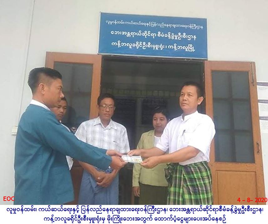 လူမှုဝန်ထမ်း၊ ကယ်ဆယ်ရေးနှင့် ပြန်လည်နေရာချထားရေး ဝန်ကြီးဌာန၊ ဘေးအန္တရာယ်ဆိုင်ရာစီမံခန့်ခွဲမှုဉီးစီးဌာန၊ ကန့်ဘလူ ခရိုင်ဦးစီးမှူးရုံးမှ တာဝန်ရှိသူများသည် (၄-၈-၂၀၂၀)ရက်နေ့ (၁၆:၀၀)နာရီအချိန်တွင် ကန့်ဘလူမြို့နယ်အတွင်း မိုးသည်းထန်စွာ ရွာသွန်းပြီး လျှပ်စီးလက်ခြင်း၊ မိုးထစ်ချုန်းခြင်းတို့ဖြစ်ပေါ်ခဲ့ရာ မိုးကြိုးဘေးကြောင့် ကန့်ဘလူမြို့နယ်၊ ကာဘိုးကျေးရွာအုပ်စု၊ ကာဘိုးကျေးရွာမှ သေဆုံးသူ(၁)ဦးအတွက် ကယ်ဆယ်ရေးရန်ပုံငွေ (၃၀၀၀၀ဝ/-)ကို ကျန်ရစ်သူ မိသားစုထံသို့ ကာဘိုးကျေးရွာ အုပ်စုအုပ် ချုပ်ရေးမှူးနှင့် တာဝန်ကျ ရပ်/ကျေးစာရေးတို့မှတစ်ဆင့် (၅-၈-၂၀၂၀)ရက်နေ့ (၁၂:၀၀) နာရီအချိန်တွင် ထောက်ပံ့ ပေးအပ်ခဲ့ပါကြောင်း သတင်းရရှိပါသည်။