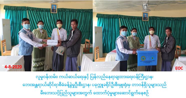 လူမှုဝန်ထမ်း၊ ကယ်ဆယ်ရေးနှင့် ပြန်လည်နေရာချထားရေးဝန်ကြီးဌာန၊ ဘေးအန္တရာယ်ဆိုင်ရာစီမံခန့်ခွဲမှုဦးစီးဌာန၊ ပခုက္ကူခရိုင်ဦးစီးမှူးရုံးမှ တာဝန်ရှိသူများသည် (၃၁-၇-၂၀၂၀) ရက်နေ့၌ မြိုင်မြို့နယ်၊ ဆင်စိန်ကျေးရွာအုပ်စု၊ တဲကြီးကျေးရွာတွင် မီးလောင်ကျွမ်းမှုဖြစ်ပွားခဲ့ရာ လူနေအိမ်(၁)လုံး၊ အိမ်ထောင်စု(၁)စု၊ လူဦးရေ(၅)ဦးအတွက် ကယ်ဆယ်ရေးပစ္စည်း(၁၇)မျိုး၊ အိမ်ထောင်စု(၁)စုစာ၊ အိမ်ဆောက်ပစ္စည်းဖိုးထောက်ပံ့ငွေ (၂ဝဝ,ဝဝဝ/-)ကျပ်၊ လူဦးရေ(၅)ဦးအတွက် ဆန်ရိက္ခာ(၇)ရက်စာဖိုး ထောက်ပံ့ငွေ(၁၀၅ဝဝ/-)ကျပ်၊ စုစုပေါင်းထောက်ပံ့ငွေ (၂၁ဝ၅၀ဝ/-)ကျပ်နှင့် First Aid Kid (၁)ထုတ်တို့အား (၄-၈-၂ဝ၂ဝ)ရက်နေ့(၁၂:ဝဝ)အချိန်တွင် ဘေးသင့်ပြည်သူများထံသို့ ထောက်ပံ့ပေးအပ်ခဲ့ပါကြောင်း သတင်းရရှိပါသည်။