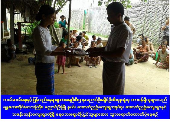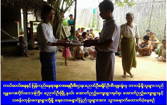 ၂။ ညောင်ဦးမြို့နယ်၊ အောက်ညဉ့်ကျေးရွာအုပ်စု၊ သဖန်းကုန်းကျေးရွာမှ ရေဘေးရှောင် အိမ်ထောင်စု (၈၇)စုမှ လူဦးရေ(၃၀၅)ဦးအတွက် ဆန်ရိက္ခာ(၃)ရက်စာဖိုး ကျသင့်ငွေ ကျပ် (၂၇၄,၅၀၀/-)၊ ခေါက်ဆွဲခြောက် တန်ဖိုးကျပ်(၈၂,၃၅၀/-)၊ ငါးသေတ္တာဗူး တန်ဖိုးကျပ် (၇၈,၃၀၀/-)၊ စုစုပေါင်းတန်ဖိုး ကျပ်(၄၃၅,၁၅၀/-)တို့အား အောက်ညဉ့်ကျေးရွာအုပ်စု အုပ်ချုပ်ရေးမှူးထံသို့ (၈-၈-၂၀၁၆) ရက်နေ့တွင် သွားရောက်ထောက်ပံ့ပေးအပ်ခဲ့ကြောင်း သတင်းရရှိပါသည်။