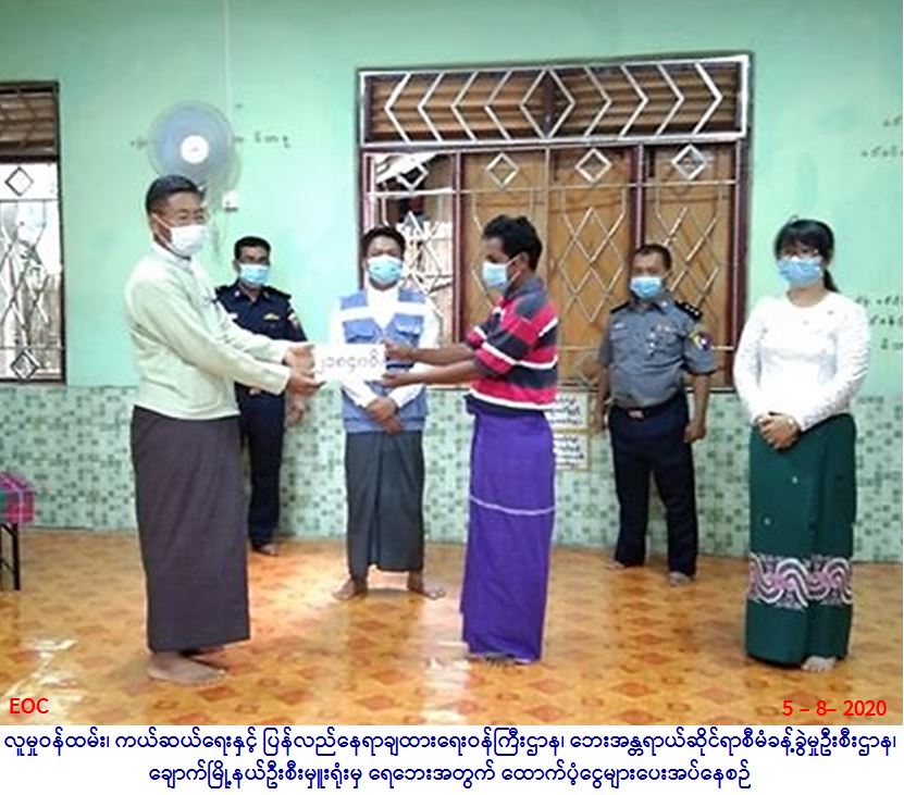 လူမှုဝန်ထမ်း၊ ကယ်ဆယ်ရေးနှင့် ပြန်လည်နေရာချထားရေး ဝန်ကြီးဌာန၊ ဘေးအန္တရာယ်ဆိုင်ရာစီမံခန့်ခွဲမှုဦးစီးဌာန၊ ချောက် မြို့နယ်ဦးစီးမှူးရုံးမှ တာဝန်ရှိသူများသည် ချောက်မြို့၊ အမှတ်(၂)ရပ်ကွက်၊ လေဘာဆိပ်ရပ်၌ (၅.၈.၂၀၂၀)ရက်နေ့တွင် ဧရာဝတီမြစ်ရေဝင်ရောက်မှုကြောင့် ကြိုတင်ပြောင်းရွှေ့ နေအိမ် (၂၅) လုံး၊ အိမ်ထောင်စု (၂၅) စု၊ စုစုပေါင်းလူဦးရေ (၁၀၄) ဦးတို့အတွက် ဆန်ရိက္ခာဖိုးထောက်ပံ့ငွေ စုစုပေါင်း (၂၁၈၄၀ဝ/-) ကျပ်အား (၅-၈-၂၀၂၀) ရက်နေ့ (၁၅:၃၀)အချိန်တွင် ချောက်မြို့နယ် အထွေထွေအုပ်ချုပ်ရေးဦးစီးဌာမှ တာဝန်ရှိသူများနှင့်အတူ ရေဘေးသင့်ပြည်သူများ၏ လက်ဝယ်အရောက် သွားရောက်ထောက်ပံ့ပေးခဲ့ပါကြောင်း သတင်းရရှိပါသည်။