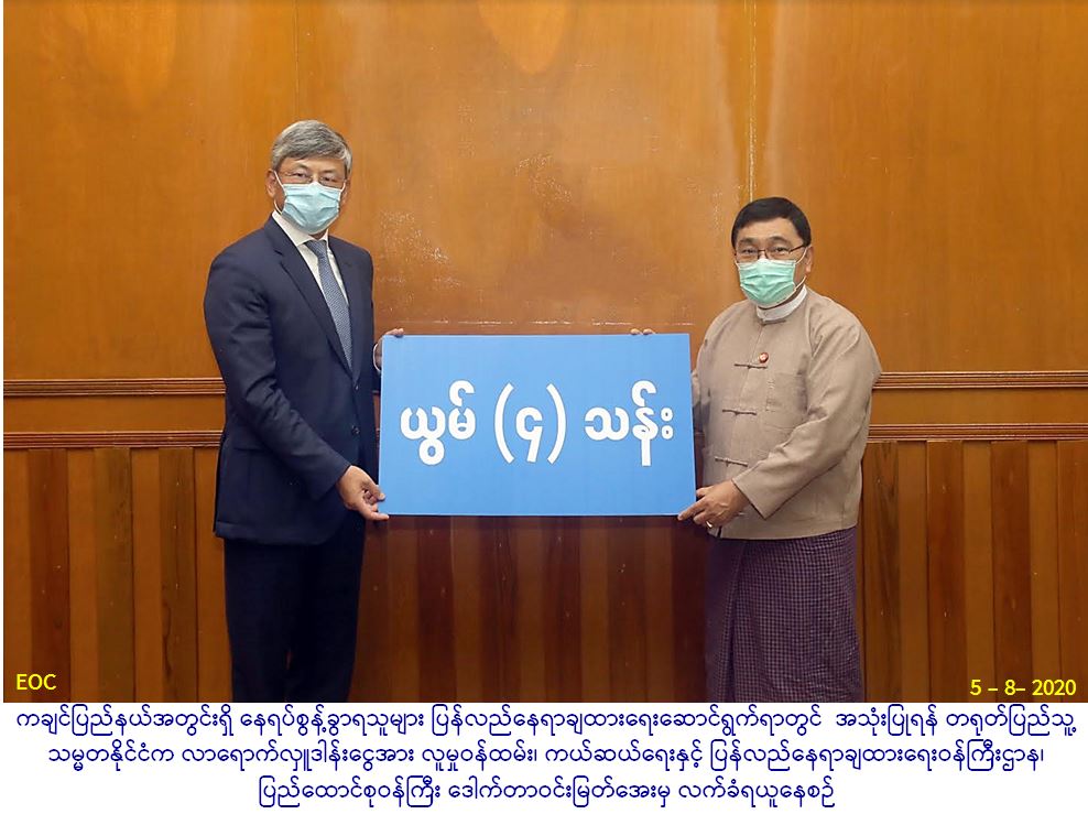 ကချင်ပြည်နယ်အတွင်းရှိ နေရပ်စွန့်ခွာရသူများ ပြန်လည်နေရာချထားရေးလုပ်ငန်းများ ဆောင်ရွက်ရာတွင် အသုံးပြုနိုင်ရန် တရုတ်ပြည်သူ့သမ္မတနိုင်ငံက လှူဒါန်းမည့် ယွမ်သန်း(၂၀၀) အနက် ကနဦးလှူဒါန်းမှုအဖြစ် ယွမ် (၄)သန်း လက်ခံခြင်း အခမ်းအနားကို လူမှုဝန်ထမ်း၊ ကယ်ဆယ်ရေးနှင့် ပြန်လည်နေရာချထားရေးဝန်ကြီးဌာန၌ ကျင်းပပြုလုပ်ရာ ပြည်ထောင်စုဝန်ကြီး ဒေါက်တာဝင်းမြတ်အေး၊ ဒုတိယဝန်ကြီး ဦးစိုးအောင်၊ ဝန်ကြီးဌာနရှိ ညွှန်ကြားရေးမှူးချုပ်များနှင့် မြန်မာနိုင်ငံဆိုင်ရာ တရုတ်ပြည်သူ့သမ္မတနိုင်ငံသံရုံးမှ သံအမတ်ကြီး H. E. Mr. Chen Hai ဦးဆောင်သည့် သံရုံးမှ သံအရာရှိများ တက်ရောက်ခဲ့ကြ ပါသည်။