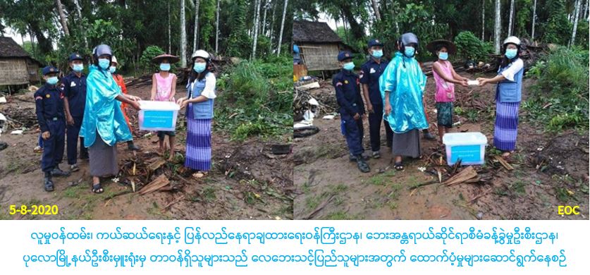 လူမှုဝန်ထမ်း၊ ကယ်ဆယ်ရေးနှင့် ပြန်လည်နေရာချထားရေးဝန်ကြီးဌာန၊ ဘေးအန္တရာယ်ဆိုင်ရာစီမံခန့်ခွဲမှုဦးစီးဌာန၊ ပုလောမြို့နယ်ဦးစီးမှူးရုံးမှ တာဝန်ရှိသူများသည် (၄-၈-၂၀၂၀)ရက်နေ့၌ ပုလောမြို့နယ်၊ ပလမြို့၊ အမှတ်(၃)ရပ်ကွက်တွင် မိုးသည်းထန်စွာရွာ သွန်းပြီး လေပြင်းတိုက်ခတ်မှုကြောင့် လုံးဝပျက်စီးနေအိမ်(၁)လုံးအတွက် အိမ်ဆောက်ပစ္စည်းဖိုးထောက်ပံ့ငွေ (၁၀၀၀၀၀/-)ကျပ် ကယ်ဆယ်ရေးပစ္စည်း(၁၆)မျိုး(၁)အိမ်ထောင်စာ၊ လူဦးရေ(၇)ဦးတွက်ဆန်ရိက္ခာ(၇)ရက်စာဖိုးထောက်ပံ့ငွေ (၁၄၇၀၀/-)ကျပ် တို့အား (၅-၈-၂၀၂၀)ရက်နေ့(၁၄း၃၀)အချိန်တွင် သွားရောက်ထောက်ပံ့ပေးအပ်ခဲ့ပါကြောင်း သတင်းရရှိသည်။