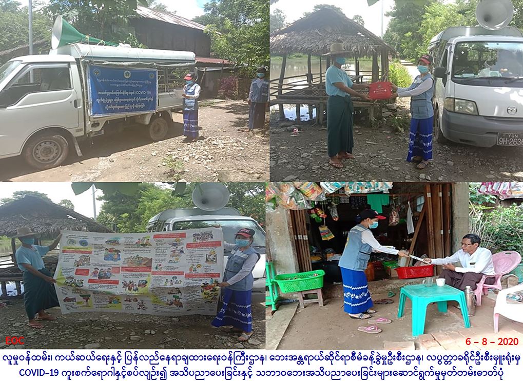 လူမှုဝန်ထမ်း၊ ကယ်ဆယ်ရေးနှင့် ပြန်လည်နေရာချထားရေး ဝန်ကြီးဌာန၊ ဘေးအန္တရာယ်ဆိုင်ရာစီမံခန့်ခွဲမှုဦးစီးဌာန၊ လပွတ္တာခရိုင် ဦးစီးမှူးရုံးမှ တာဝန်ရှိသူများသည် အထွေထွေအုပ်ချုပ်ရေးဦးစီးဌာနနှင့် အတူပူးပေါင်း၍ (၆-၈-၂၀၂၀)ရက်နေ့၊ (၀၈:၀၀) နာရီအချိန်မှ (၁၂:၀၀)နာရီအချိန်ထိ လပွတ္တာမြို့နယ်၊ လပွတ္တလုပ် တောင်/မြောက်ကျေးရွာအုပ်စု၊ လပွတ္တလုပ်တောင်/မြောက် ကျေးရွာ၊ ကွမ်းခြံကုန်းကျေးရွာ၊ ကြိမ်ချောင်းကျေးရွာ၊ ကန့်ဘလာကျေးရွာ၊ သရက်ကုန်းကျေးရွာ၊ ဘုရားကြီးကျေးရွာ၊ ပိန္နဲကုန်းကျေးရွာနှင့် ဓမင်းချောင်းကျေးရွာ များတို့တွင် (ဒုတိယအကြိမ်) Covid-19 အသက်ရှူလမ်းကြောင်း ဆိုင်ရာ ရောဂါနှင့် ပတ်သက်၍ ကျန်းမာရေးနှင့်အားကစား၀န်ကြီး ဌာနမှ ထုတ်ပြန်ထားသည့် အသိပေးကြေညာချက်များ၊ သဘာဝဘေးအန္တရာယ် ဆိုင်ရာအသိပညာပေးခြင်း၊ လက်ကမ်းစာစောင်များ၊ ဗီနိုင်းနှင့် First Aid Kit ဝေငှခြင်းများကို အများပြည်သူများ သိရှိလိုက်နာ ရန်ကွင်းဆင်း၍ Loud Speaker ဖြင့်လှည့်လှည်၍ အသိပညာပေးလုပ်ငန်းများ ဆောင်ရွက်ခဲ့ပါကြောင်း သတင်းရရှိပါသည်။
