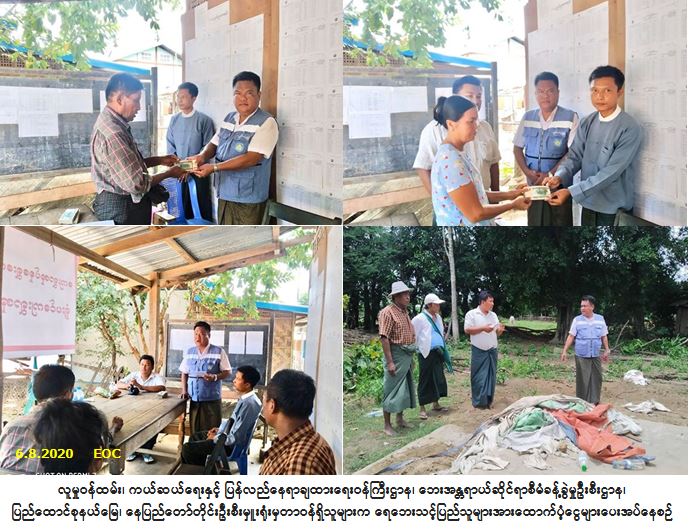 လူမှုဝန်ထမ်း၊ ကယ်ဆယ်ရေးနှင့် ပြန်လည်နေရာချထားရေးဝန်ကြီးဌာန၊ ဘေးအန္တရာယ်ဆိုင်ရာစီမံခန့်ခွဲမှုဦးစီး ဌာန၊ ပြည်ထောင်စုနယ်မြေ၊ နေပြည်တော်တိုင်းဦးစီးမှူးရုံးမှတာဝန်ရှိသူများသည် ပြည်ထောင်စုနယ်မြေ၊ နေပြည်တော်၊ ဒက္ခိဏခရိုင်၊ လယ်ဝေးမြို့နယ်၊ ရုံးပင်ကျေးရွာအုပ်စု၊ ရုံးပင်ကျေးရွာ၌ (၅-၈-၂၀၂၀) ရက်နေ့တွင် ဖြစ်ပွားခဲ့သော မိုးသည်းထန်စွာရွာသွန်း၍ ပလွေးချောင်းရေ မြင့်တက်လာမှုကြောင့် ကြိုတင်ဖျက်သိမ်းပြောင်းရွှေ့ နေအိမ်(၃)လုံးအတွက် အိမ်ဆောက်ပစ္စည်းဖိုးထောက်ပံ့ငွေ (၃၀၀,၀၀ဝ/-)ကျပ်၊ ဘေးသင့်လူဦးရေ(၁၀)ဦးအတွက် ဆန်ရိက္ခာဖိုးထောက်ပံငွေ(၂၁,၀၀ဝ/-)ကျပ်တို့ကို (၆-၈-၂၀၂၀) ရက်နေ့၊ (၁၃:၀၀) နာရီအချိန်တွင် သွားရောက်ထောက်ပံ့ပေးအပ်ခဲ့ပါကြောင်း သတင်းရရှိပါသည်။