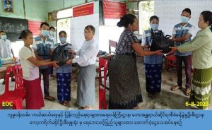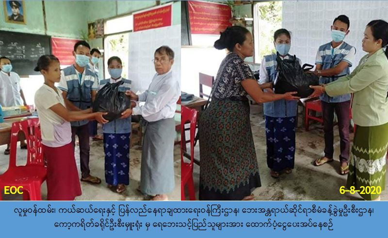 လူမှုဝန်ထမ်း၊ ကယ်ဆယ်ရေးနှင့် ပြန်လည်နေရာချထားရေးဝန်ကြီးဌာန၊ ဘေးအန္တရာယ်ဆိုင်ရာ စီမံခန့်ခွဲမှုဦးစီးဌာန၊ ကော့ကရိတ်ခရိုင်ဦးစီးမှူးရုံးနှင့် ကြာအင်းဆိပ်ကြီးမြို့နယ်ဦးစီးမှူးရုံးတို့မှ တာဝန်ရှိသူများသည် (၅-၈-၂၀၂၀) ရက်နေ့တွင် ဖြစ်ပွားခဲ့သော မိုးရွာသွန်းမှုကြောင့် ရေလွတ် ရာနေရာများသို့ ကြိုတင်ပြောင်းရွှေ့နေထိုင်ကြရသော ကြာအင်းဆိပ်ကြီးမြို့နယ်၊ အမှတ်(၆) ရပ်ကွက်၊ ဇမိမြစ်ကမ်းဘေးရှိ အိမ်ခြေ (၂၁) လုံး၊ အိမ်ထောင်စု(၂၁) စု မှ လူဦးရေ (၈၃) ဦး တို့အတွက် (၁၇၄,၃၀၀/-) ကျပ်တန်ဖိုးရှိ ဆန်ရိက္ခာ(၇) ရက်စာအား (၆-၈-၂၀၂၀) ရက်နေ့တွင် ဘေးသင့်ပြည်သူများလက်ဝယ်အရောက် သွားရောက်ထောက်ပံခဲ့ပါကြောင်း သတင်းရရှိပါ သည်။