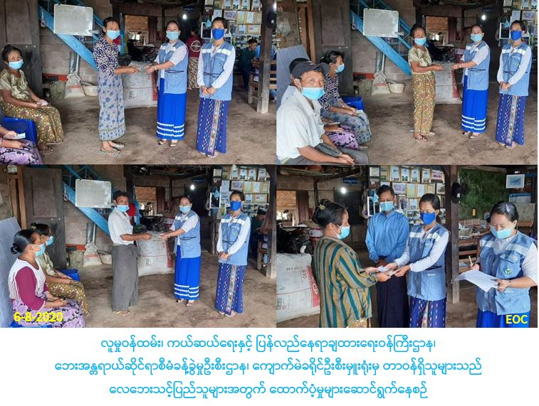 လူမှုဝန်ထမ်း၊ ကယ်ဆယ်ရေးနှင့် ပြန်လည်နေရာချထားရေးဝန်ကြီးဌာန၊ ဘေးအန္တရာယ်ဆိုင်ရာစီမံခန့်ခွဲမှုဦးစီးဌာန၊ ကျောက်မဲခရိုင်ဦးစီးမှူးရုံးမှ တာဝန်ရှိသူများသည် (၃-၈-၂၀၂၀)ရက်နေ့၌ ကျောက်မဲမြို့နယ်၊ ပန်လက်ကျေးရွာအုပ်စု၊ ပန်လင် ကျေးရွာတွင် လေပြင်းတိုက်ခတ်မှုကြောင့် အမိုးလန်ပျက်စီးခဲ့သည့် လူနေအိမ်(၆)လုံး၊ အိမ်ထောင်စု(၆)စုအတွက် အိမ်ဆောက် ပစ္စည်းဖိုးထောက်ပံ့ငွေ (၃၈၄,၇၅ဝ/-)ကျပ်နှင့် လူဦးရေ(၃၂)ဦးအတွက် ဆန်ရိက္ခာ(၇)ရက်စာဖိုးထောက်ပံ့ငွေ(၆၇,၂၀ဝ/-)ကျပ်၊ စုစုပေါင်းထောပ်ပံ့ငွေ(၄၅၁,၉၅ဝ/-)ကျပ်အား (၆-၈-၂၀၂၀)ရက်နေ့(၁၀း၀၀)နာရီအချိန်တွင် ကျေးရွာအုပ်ချုပ်ရေးမှူးနှင့်အတူ ပြည်သူများ လက်၀ယ်အရောက်ထောက်ပံ့ခဲ့ပါကြောင်း သတင်းရရှိသည်။