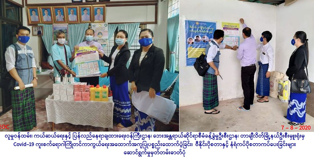 လူမှုဝန်ထမ်း၊ ကယ်ဆယ်ရေးနှင့်ပြန်လည်နေရာချထားရေးဝန်ကြီးဌာန၊ ဘေးအန္တရာယ်ဆိုင်ရာစီမံခန့်ခွဲမှုဦးစီးဌာန၊ တာချီလိတ် မြို့နယ်ဦးစီးမှူးရုံးမှ တာဝန်ရှိသူများသည် (၇.၈.၂၀၂၀) ရက်နေ့တွင် Irrawaddy Green Towers Ltd နှင့် ပူးပေါင်း၍ မကာဟိုခမ်းရပ်၊ စိန်ဂျုဒ်ဘုရားကျောင်း၌ (Covid-19) ကူးစက်ရောဂါကြိုတင်ကာကွယ်ရေး အထောက်အကူပြု ပစ္စည်းပေးအပ် လှူဒါန်းခဲ့ပြီး အသိပညာပေးဗီနိုင်းပိုစတာနှင့် ကပ်ခြင်နံရံကပ်ပိုစတာကပ်ပေးခြင်းများ ဆောင်ရွက်ခဲ့ပါကြောင်း သတင်းရရှိပါသည်။