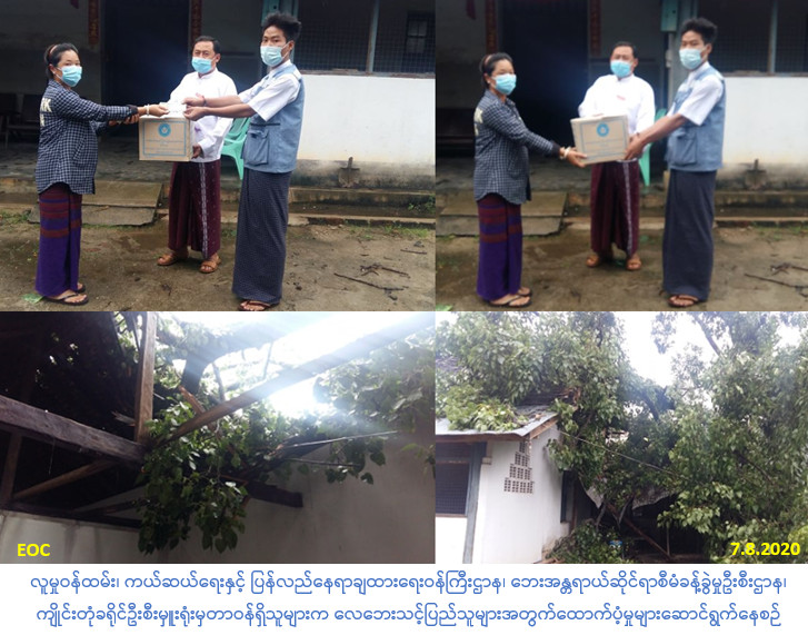 လူမှုဝန်ထမ်း၊ ကယ်ဆယ်ရေးနှင့် ပြန်လည်နေရာချထားရေးဝန်ကြီးဌာန၊ ဘေးအန္တရာယ်ဆိုင်ရာစီမံခန့်ခွဲမှုဦးစီးဌာန၊ ကျိုင်းတုံခရိုင်ဦးစီးမှူးရုံးမှတာဝန်ရှိသူများသည် (၇-၈-၂၀၂၀)ရက်နေ့၊ (၀၆:၃၀)အချိန်ခန့်တွင် ကျိုင်းတုံခရိုင်၊ ကျိုင်းတုံမြို့ အမှတ်(၁)ရပ်ကွက်၊ ကျိုင်းခုံရပ်၌ ဖြစ်ပွား ခဲ့သည့် လေပြင်းတိုက်ခတ်မှုကြောင့် အိမ်ခြေ(၁)လုံး၊ အိမ်ထောင်စု(၁)စုနှင့် လူဦးရေစုစုပေါင်း (၅)ဦးတို့ လေဘေးသင့်ခဲ့ရာ ဆုံးရှုံးမှုတန်ဖိုးမှာကျပ်(၂၀၀,၀၀၀/-)ခန့်ဖြစ်ပြီး၊ အဆိုပါလေပြင်း ဘေးသင့်နေအိမ်(၁)လုံးအတွက် အိမ်ဆောက်ပစ္စည်းဖိုးထောက်ပံ့ငွေ(၁၀၀,၀၀၀/-)ကျပ်၊ လူဦးရေ (၅)ဦးအတွက် ဆန်ရိက္ခာ(၁)ပတ်စာဖိုးထောက်ပံ့ငွေ(၁၀,၅၀၀/-)ကျပ်နှင့် ကယ်ဆယ်ရေးပစ္စည်း (၁၀)မျိုးတို့အား (၇-၈-၂၀၂၀)ရက်နေ့၊ (၁၈:၀၀)နာရီအချိန်ခန့်တွင် ဘေးသင့်ပြည်သူများ လက်ဝယ်အရောက် သွားရောက်ထောက်ပံ့ခဲ့ပါကြောင်း သတင်းရရှိပါသည်။