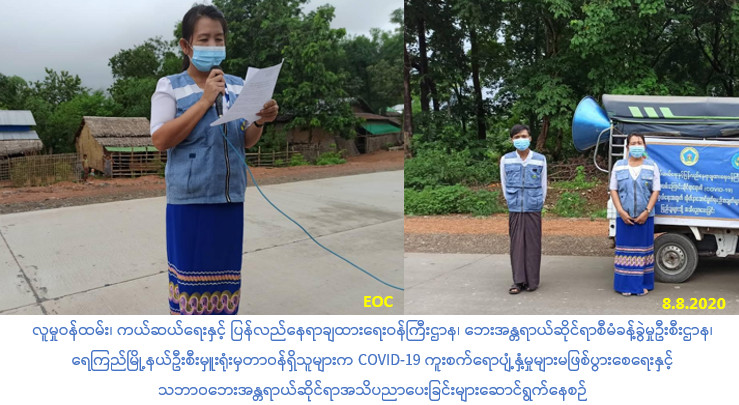 လူမှုဝန်ထမ်း၊ ကယ်ဆယ်ရေးနှင့် ပြန်လည်နေရာချထားရေးဝန်ကြီးဌာန၊ ဘေးအန္တရာယ်ဆိုင်ရာစီမံခန့်ခွဲမှုဦးစီးဌာန၊ ရေကြည်မြို့နယ်ဦးစီးမှူးရုံးမှတာဝန်ရှိသူများသည် (၈-၈-၂၀၂၀)ရက်နေ့၊ (၀၈:၀၀)နာရီအချိန်မှစတင်၍ ရေကြည်မြို့နယ်၊ ငါးသိုင်းချောင်းမြို့၊ ဂွေးတောက်ကျေးရွာအုပ်စု၊ တောင်စမ်းကျေးရွာ၊ မြောက်စမ်းကျေးရွာ၊ ကွမ်းခြံကုန်းကျေးရွာ၊ တောင်ကုန်းစခန်းကျေးရွာ၊ ပိတ်ရှည်ကျေးရွာတို့တွင် Covid-19 ဒုတိယလှိုင်းကူးစက်မှု မဖြစ်ပွားစေရန်နှင့် သဘာဝဘေးနှင့် ပက်သက်သည့် ဆောင်ရန်/ ရှောင်ရန်များကို ကျေးရွာနေ မိဘပြည်သူတို့အား အသိပညာပေး ဟောပြောဆောင်ရွက်ခဲ့ပါကြောင်း သတင်းရရှိပါသည်။