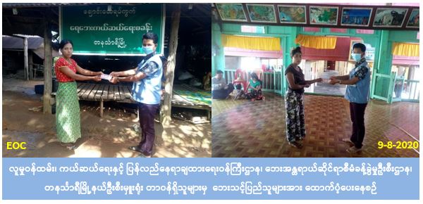လူမှုဝန်ထမ်း၊ ကယ်ဆယ်ရေးနှင့် ပြန်လည်နေရာချထားရေးဝန်ကြီးဌာန၊ ဘေးအန္တရာယ်ဆိုင်ရာစီမံခန့်ခွဲမှုဦးစီးဌာန၊ တနင်္သာရီမြို့နယ်ဦးစီးမှူးရုံးမှ တာဝန်ရှိသူများသည် (၇-၈-၂၀၂၀) ရက်နေ့၊ မြစ်ရေကြီးမှုကြောင့် ကယ်ဆယ်ရေးစခန်းသို့ ပြောင်းရွှေ့နေထိုင်သည့် အိမ်ထောင်စု (၁၁) စုမှ လူဦးရေ (၄၄) ဦးအတွက် ဆန်ဖိုး (၇) ရက်စာထောက်ပံ့ငွေ (၉၂၄၀၀) ကို (၉-၈-၂၀၂၀) ရက်နေ့ (၁၂း၀၀) အချိန်တွင် ဒုတိယမြို့နယ်အုပ်ချုပ်ရေးမှူး၊ ရပ်ကျေးအုပ်ချုပ်ရေးမှုးများနှင့်အတူ ထောက်ပံ့ပေးခဲ့ကြောင်း သတင်းရရှိပါသည်။