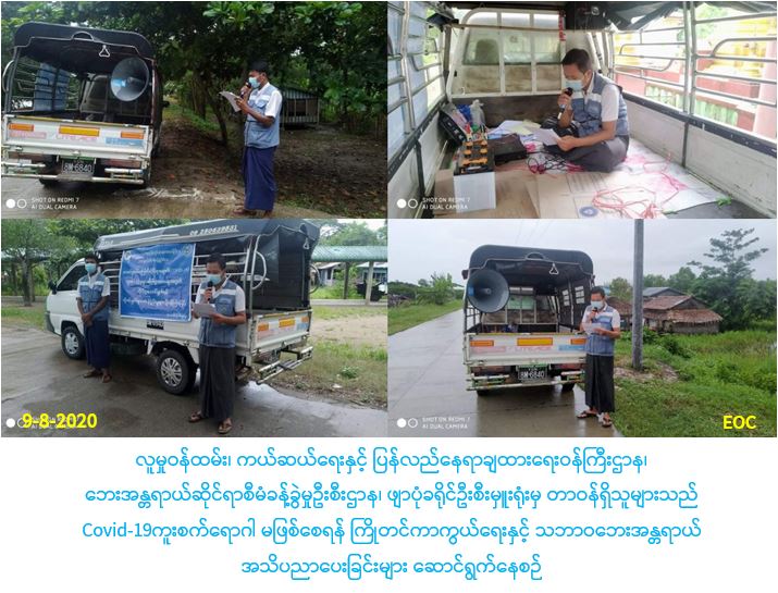 လူမှုဝန်ထမ်း၊ ကယ်ဆယ်ရေးနှင့် ပြန်လည်နေရာချထားရေးဝန်ကြီးဌာန၊ ဘေးအန္တရာယ်ဆိုင်ရာစီမံခန့်ခွဲမှုဦးစီးဌာန၊ ဖျာပုံခရိုင်ဦးစီးမှူးရုံးမှ တာဝန်ရှိသူများသည် (၉-၈-၂၀၂၀) ရက်နေ့တွင် ကျိုက်လတ်မြို့နယ်၊ တပေတမော့ကျေးရွာအုပ်စု၊ ပန်းပဲစုကျေးရွာ၊ ကျုံကလွတ်ကျေးရွာအုပ်စုတို့၌ COVID -19 ရောဂါကူးစက်ပျံ့နှံ့မှု ဒုတိယလှိုင်းမဖြစ်ပွားစေရန်အတွက် အများ ပြည်သူ အလွယ်တကူသိရှိလိုက်နာ ဆောင်ရွက်ရန် အချက်များနှင့် မိုးရာသီတွင် ဖြစ်ပွားလေ့ရှိသည့် သဘာဝဘေးအန္တရာယ် များကို ကြိုတင်ပြင်ဆင်ရေး အသိပေးချက်များကို လှည့်လည်ဟောပြောခြင်း၊ ဘေး(၈)မျိုး လက်ကမ်းစာစောင် ဝေငှခြင်းများ ဆောင်ရွက်ခဲ့ပါကြောင်း သတင်းရရှိပါသည်။