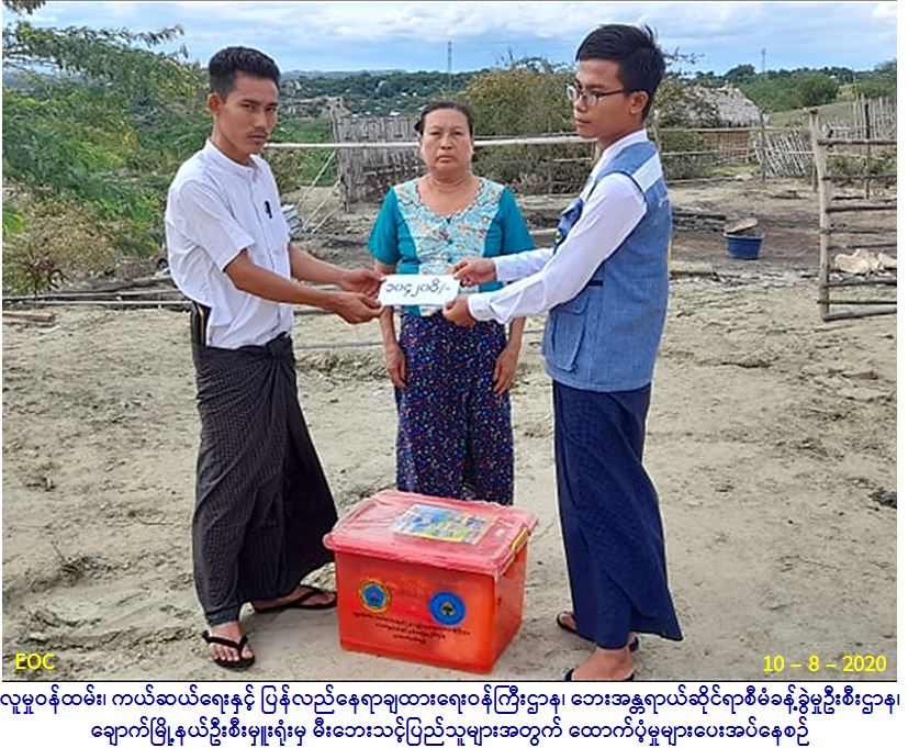 လူမှု၀န်ထမ်း၊ ကယ်ဆယ်ရေးနှင့်ပြန်လည်နေရာချထားရေး၀န်ကြီးဌာန၊ ဘေးအန္တရာယ်ဆိုင်ရာစီမံခန့်ခွဲမှုဦးစီးဌာန၊ ချောက်မြို့နယ်ဦးစီးမှူးရုံးမှ တာဝန်ရှိသူများသည် ချောက်မြို့၊ အမှတ်(၁၀)ရပ်ကွက်၊ အေးစေတီရပ်၌ (၉-၈-၂၀၂၀) ရက်နေ့၊ (၁၄:၂၅) အချိန်တွင် ဖြစ်ပွားခဲ့သော မီးဘေးကြောင့် လုံးဝပျက်စီးနေအိမ်(၁)လုံး၊ အိမ်ထောင်စု(၁)စု၊ လူဦးရေ(၂)ဦးတို့ဘေးသင့်ခဲ့ရာ အဆိုပါဘေးသင့် ပြည်သူများအတွက် အိမ်ဆောက်ပစ္စည်းဖိုးထောက်ပံ့ငွေ (၁၀၀၀,၀ဝ/-)ကျပ်၊ ဆန်ရိက္ခဖိုးငွေ(၄၂၀၀/-)ကျပ်၊ စုစုပေါင်း(၁၀၄၂၀၀/-)ကျပ်တို့ကို (၁၀-၈-၂၀၂၀) ရက်နေ့တွင် ချောက်မြို့နယ်အထွေထွေအုပ်ချုပ်ရေးဦးစီးဌာမှ တာဝန်ရှိသူများ နှင့်အတူ ဘေးသင့်ပြည်သူများ၏လက်ဝယ်အရောက် သွားရောက်ထောက်ပံ့ပေးခဲ့ပါကြောင်း သတင်းရရှိပါသည်။