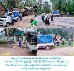 လူမှုဝန်ထမ်း၊ ကယ်ဆယ်ရေးနှင့် ပြန်လည်နေရာချထားရေးဝန်ကြီးဌာန၊ ဘေးအန္တရာယ်ဆိုင်ရာစီမံခန့်ခွဲမှုဦးစီးဌာန၊ မြောင်းမြခရိုင်ဦးစီးမှူးရုံးမှ တာဝန်ရှိသူများသည် (၁၁-၈-၂၀၂၀) ရက်နေ့ ၊ (၁၀း၃၀) နာရီအချိန်မှ (၁၅း၃၀) နာရီအချိန်အထိ မြောင်းမြခရိုင်၊ မြောင်းမြမြို့နယ်အတွင်းရှိ သိလ္လာဂါတ်စုကျေးရွာ၊ ကညင်ကုန်းကျေးရွာ၊ တောင်ပေါ်စုကျေးရွာ၊ သိလ္လာချောင်းဖျားကျေးရွာ၊ ဆောင်ပုံကျေးရွာ၊ တေါင်ဒီးရွာသစ်ကျေးရွာ၊ ဆိပ်သာတောင်ကုန်းကျေးရွာနှင့် ဦးထုပ်ကွင်း ကျေးရွာတို့တွင် လတ်တလောနိုင်ငံအသီးသီးတွင် ကူးစက်ပြန့်ပွားလျက်ရှိသော Covid -19 ကူးစက်ရောဂါ ထိန်းချုပ်ရေးနှင့် အရေးပေါ်တုန့်ပြန်ရေးကော်မတီမှ (၂၉-၇-၂၀၂၀)ရက်နေ့အထိ ထုတ်ပြန်ပြီးဖြစ်သည့် တားမြစ်မိန့်နှင့် ညွှန်ကြားချက်များအား လည်းကောင်း၊ ရာသီအလိုက်ဖြစ်ပွားတက်သော သဘာဝဘေးအန္တရာယ်များနှင့် ပတ်သတ်သည့် သဘာဝဘေးအသိပညာပေး ခြင်းတို့အားလည်းကောင်း အများပြည်သူများသိရှိလိုက်နာရန် ကွင်းဆင်းလှည့်လည်၍ အသိပညာပေးခြင်း လုပ်ငန်းများ ပြုလုပ်ဆောင်ရွက်ခဲ့ပါကြောင်း သတင်းရရှိပါသည်။