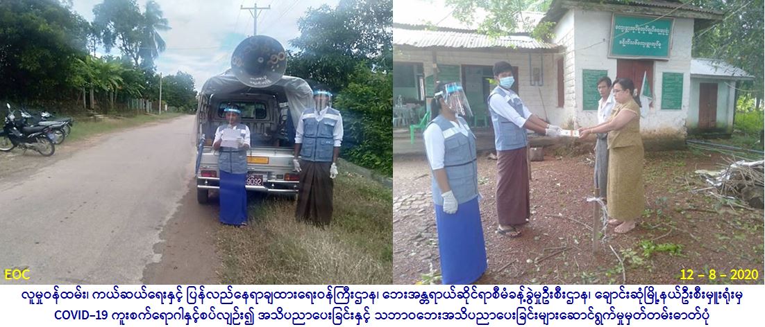 လူမှုဝန်ထမ်း၊ ကယ်ဆယ်ရေးနှင့် ပြန်လည်နေရာချထားရေး ဝန်ကြီးဌာန၊ ဘေးအန္တရာယ်ဆိုင်ရာစီမံခန့်ခွဲမှုဦးစီးဌာန၊ ချောင်းဆုံ မြို့နယ်ဦးစီးမှူးရုံးမှ တာဝန်ရှိသူများသည် (၁၂-၈-၂၀၂၀) ရက်နေ့တွင် ချောင်းဆုံမြို့နယ်အတွင်းရှိ တိုးချဲ့ရပ်ကွက်နှင့် ခရိုက်သစ် ကျေးရွာတို့၌ COVID-19 ကူးစက်ရောဂါနှင့်စပ်လျဉ်း၍ ဆောင်ရန်/ရှောင်ရန် အချက်များ၊ ရေဘေး၊ မုန်တိုင်းဘေး၊ မြေပြိုဘေး၊ မိုးကြိုးဘေးတို့နှင့် စပ်လျဉ်း၍ ဆောင်ရန်/ရှောင်ရန်အချက်များကို အသံချဲ့စက်တို့ဖြင့် လှည့်လည်အသိပညာပေးနှိုးဆော်ခဲ့ပြီး လက်ကမ်းစာစောင်များ ဝေငှပေးခဲ့ပါကြောင်း သတင်းရရှိပါသည်။