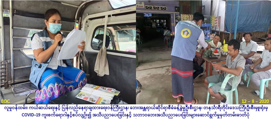 လူမှုဝန်ထမ်း၊ ကယ်ဆယ်ရေးနှင့် ပြန်လည်နေရာချထားရေး ဝန်ကြီးဌာန၊ ဘေးအန္တရာယ်ဆိုင်ရာစီမံခန့်ခွဲမှုဦးစီးဌာန၊ တနင်္သာရီ တိုင်းဒေသကြီးဦးစီးမှူးရုံးမှ တာဝန်ရှိသူများသည် (၁၂.၈.၂၀၂၀) ရက်နေ့တွင် ထားဝယ်မြို့နယ်အတွင်းရှိ ပကာရီကျေးရွာနှင့် သဗျာကျေးရွာတို့တွင် လော်စပီကာတို့ဖြင့် Covid-19 ရောဂါနှင့်ပက်သက်၍ လိုက်နာဆောင်ရွက်ရမည့်အချက်များနှင့် မိုးရာသီ ကာလသို့ ရောက်ရှိလာပြီဖြစ်သည့်အတွက် ရေဘေး၊ မြေပြိုဘေးနှင့် မိုးကြိုးဘေးစသည့် သဘာဝဘေး အန္တရာယ်နှင့်ပတ်သက် သည့် ဆောင်ရန်/ရှောင်ရန်အချက်များအား ပြည်သူသို့ အသိပညာပေးပန်ကြားချက်များအား လှည့်လည်ကြေညာခြင်းများ ဆောင်ရွက်ခဲ့ပြီး လက်ကမ်းစာစောင်များဝေငှခဲ့ပါကြောင်း သတင်းရရှိပါသည်။