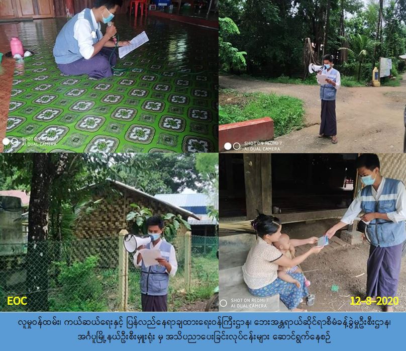 လူမှုဝန်ထမ်း၊ ကယ်ဆယ်ရေးနှင့်ပြန်လည်နေရာချထားရေးဝန်ကြီးဌာန၊ ဘေးအန္တရာယ်ဆိုင်ရာ စီမံခန့်ခွဲမှုဦးစီးဌာန၊ အင်္ဂပူမြို့နယ်ဦးစီးမှူးရုံးမှ တာဝန်ရှိသူများသည် (၁၂-၈-၂၀၂၀) ရက်နေ့၊ (၀၉:၃၀) နာရီအချိန်မှစ၍ ကွင်းလှကျေးရွာအုပ်စု၊ ကွင်းလှကျေးရွာ၊ အလယ်ရိုးကျေးရွာ၊ လင် ကောင်ပိုးကျေးရွာ၊ ဝက်ကြီးချောင်ကျေးရွာ၊ ရွှေကြို့ပင်ကျေးရွာ၊ ငါးပုတ်ကွင်းကျေးရွာ၊ ရှမ်း စုကျေးရွာ၊ ကြီးပင်ကွင်းကျေးရွာ၊ ညောင်ပင်လျှိုကျေးရွာ၊ နွားနက်ကွင်းကျေးရွာနှင့် ထန်းကုန်း ကျေးရွာတို့တွင် ကျန်းမာရေးနှင့်အားကစားဝန်ကြီးဌာနမှ ထုတ်ပြန်ထားသော Covid-19 ကူး စက်မှုဒုတိယလှိုင်းမဖြစ်စေရန် အသိပညာပေးခြင်းလုပ်ငန်းများနှင့် ဧရာဝတီတိုင်းဒေသကြီး Covid-19 ထိန်းချုပ်ရေးနှင့် အရေးပေါ်တုံ့ပြန်ရေးကော်မတီမှ ထုတ်ပြန်သည့် တားမြစ်မိန့်နှင့် ညွှန်ကြားချက်များအားလည်းကောင်း၊ ရာသီအလိုက်ဖြစ်ပွားတတ်သော သဘာဝဘေးအန္တရာယ် များနှင့် ပတ်သက်သည့် သဘာဝဘေးအသိပညာပေးခဲ့ပြီး လက်ကမ်းစာစောင်များ ဖြန့်ဝေခြင်း တို့အားလည်းကောင်း၊ အများပြည်သူများသိရှိလိုက်နာရန် ကွင်းဆင်းလှည့်လှည်၍ အသိပညာ ပေးလုပ်ငန်းများဆောင်ရွက်ခဲ့ပါကြောင်း သတင်းရရှိပါသည်။