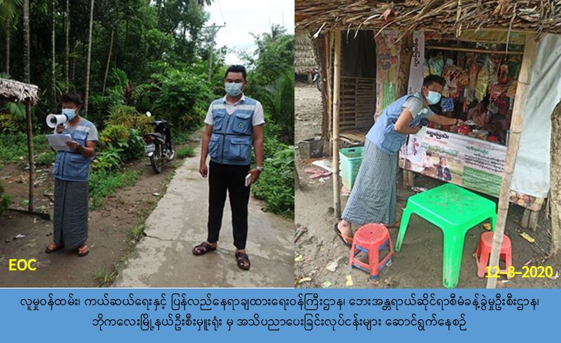 လူမှုဝန်ထမ်း၊ ကယ်ဆယ်ရေးနှင့်ပြန်လည်နေရာချထားရေးဝန်ကြီးဌာန၊ ဘေးအန္တရာယ်ဆိုင်ရာ စီမံခန့်ခွဲမှုဦးစီးဌာန၊ ဘိုကလေးမြို့နယ်ဦးစီးမှူးရုံးမှ တာဝန်ရှိသူများသည် (၁၂-၈-၂၀၂၀) ရက် နေ့တွင် ဘိုကလေးမြို့နယ်၊ မြသိန်းတန်ကျေးရွာအုပ်စု၊ မြသိန်းတန်ကျေးရွာတွင် (၀၉:၀၀) နာရီ အချိန်၌လည်းကောင်း၊ ဆင်ကွင်းကျေးရွာတွင် (၀၉:၃၀) နာရီအချိန်၌လည်းကောင်း၊ ကြံ့ခင်းစု ကျေးရွာတွင်(၁၀:၀၀) နာရီ၌လည်းကောင်း၊ ဘူတင်စုကျေးရွာတွင် (၁၀:၃၀) နာရီ၌ လည်း ကောင်း၊ ကံကုန်းကျေးရွာတွင် (၁၁:၀၀) နာရီ၌လည်းကောင်း၊ လိပ်ကမ္ဘာကျေးရွာတွင် (၁၁:၃၀) နာရီ၌လည်းကောင်း ကျန်းမာရေးနှင့်အားကစားဝန်ကြီးဌာနမှ ထုတ်ပြန်ထားသော Covid-19 ကူးစက်မှု ဒုတိယလှိုင်းမဖြစ်စေရန် အသိပညာပေးခြင်းလုပ်ငန်းများနှင့် ဧရာဝတီတိုင်းဒေသကြီး Covid -19 ထိန်းချုပ်ရေးနှင့် အရေးပေါ်တုံ့ပြန်ရေးကော်မတီမှ (၁၄-၇-၂၀၂၀) ရက်နေ့အထိ ထုတ်ပြန်ပြီးဖြစ်သည့် တားမြစ်မိန့်နှင့် ညွန်ကြားချက်အားလည်းကောင်း၊ ရာသီအလိုက်ဖြစ်ပွား တတ်သော သဘာဝဘေးများအန္တရာယ်များနှင့် ပတ်သက်သည့် သဘာဝဘေးအသိပညာပေး ခြင်းတို့အားလည်းကောင်း၊ အများပြည်သူများသိရှိလိုက်နာရန် ကွင်းဆင်းလှည့်လှည်၍ အသိ ပညာပေးလုပ်ငန်းများ ဆောင်ရွက်ခဲ့ပါကြောင်း သတင်းရရှိပါသည်။