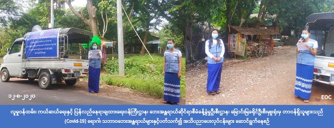 လူမှုဝန်ထမ်း၊ ကယ်ဆယ်ရေးနှင့် ပြန်လည်နေရာချထားရေးဝန်ကြီးဌာန၊ ဘေးအန္တရာယ်ဆိုင်ရာစီမံခန့်ခွဲမှုဦးစီးဌာန မြောင်းမြခရိုင်ဦးစီးမှူးရုံးမှ တာဝန်ရှိသူများသည် (၁၃-၈-၂၀၂၀) ရက်နေ့ ၊ မနက် (၀၉:၃၀) နာရီအချိန်မှစ၍ နေ့လည် (၁၂:၃၀) နာရီအချိန်အထိ မြောင်းမြခရိုင်၊ မြောင်းမြမြို့နယ်အတွင်းရှိ ခွေးလေးကြီးကျေးရွာ၊ ဖျာပုံစုကျေးရွာ၊ ဝါးကြိတ်လိန်ကျေးရွာ၊ လှဲဆိတ်ကြီးကျေးရွာ၊ ဂယက်ကြီးကျေးရွာ၊ ရှစ်အိမ်တန်းကျေးရွာ၊ ကုက္ကိုစုကျေးရွာ၊ ခွေးလေးဝကျေးရွာ၊ ကွင်းကလေးကျေးရွာတို့တွင် လတ်တလောနိုင်ငံအသီးသီးတွင် ကူးစက်ပြန့်ပွားလျက်ရှိသော Covid -19 ရောဂါထိန်းချုပ်ရေးနှင့် အရေးပေါ်တုန့်ပြန်ရေးကော်မတီမှ (၂၉-၇-၂၀၂၀)ရက်နေ့အထိ ထုတ်ပြန်ပြီးဖြစ်သည့် တားမြစ်မိန့်နှင့် ညွှန်ကြားချက်များအားလည်းကောင်း၊ ရာသီအလိုက် ဖြစ်ပွားတတ်သော သဘာဝဘေးအန္တရာယ်များနှင့် ပတ်သက်သည့် သဘာဝဘေးအသိပညာပေးခြင်း တို့ကိုလည်းကောင်း အများပြည်သူများသိရှိလိုက်နာရန် ကွင်းဆင်းလှည့်လည်၍ အသိပညာပေးခြင်းလုပ်ငန်းများ ပြုလုပ်ဆောင်ရွက်ခဲ့ကြောင်း သိရှိရပါသည်။